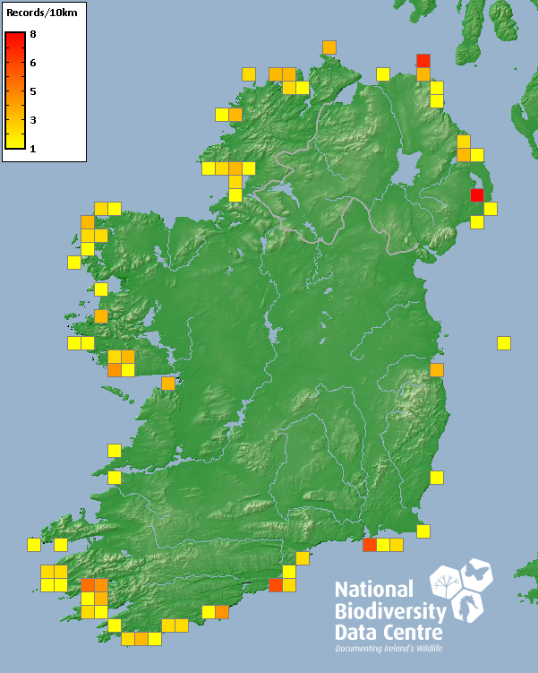 Distribution of the number of records recorded within each 10km grid square (ITM).Marine Map - 50km