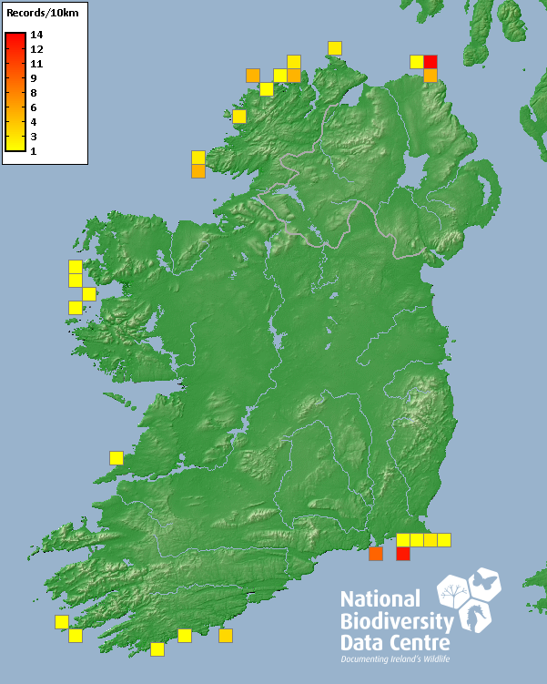 Distribution of the number of records recorded within each 10km grid square (ITM).Marine Map - 50km