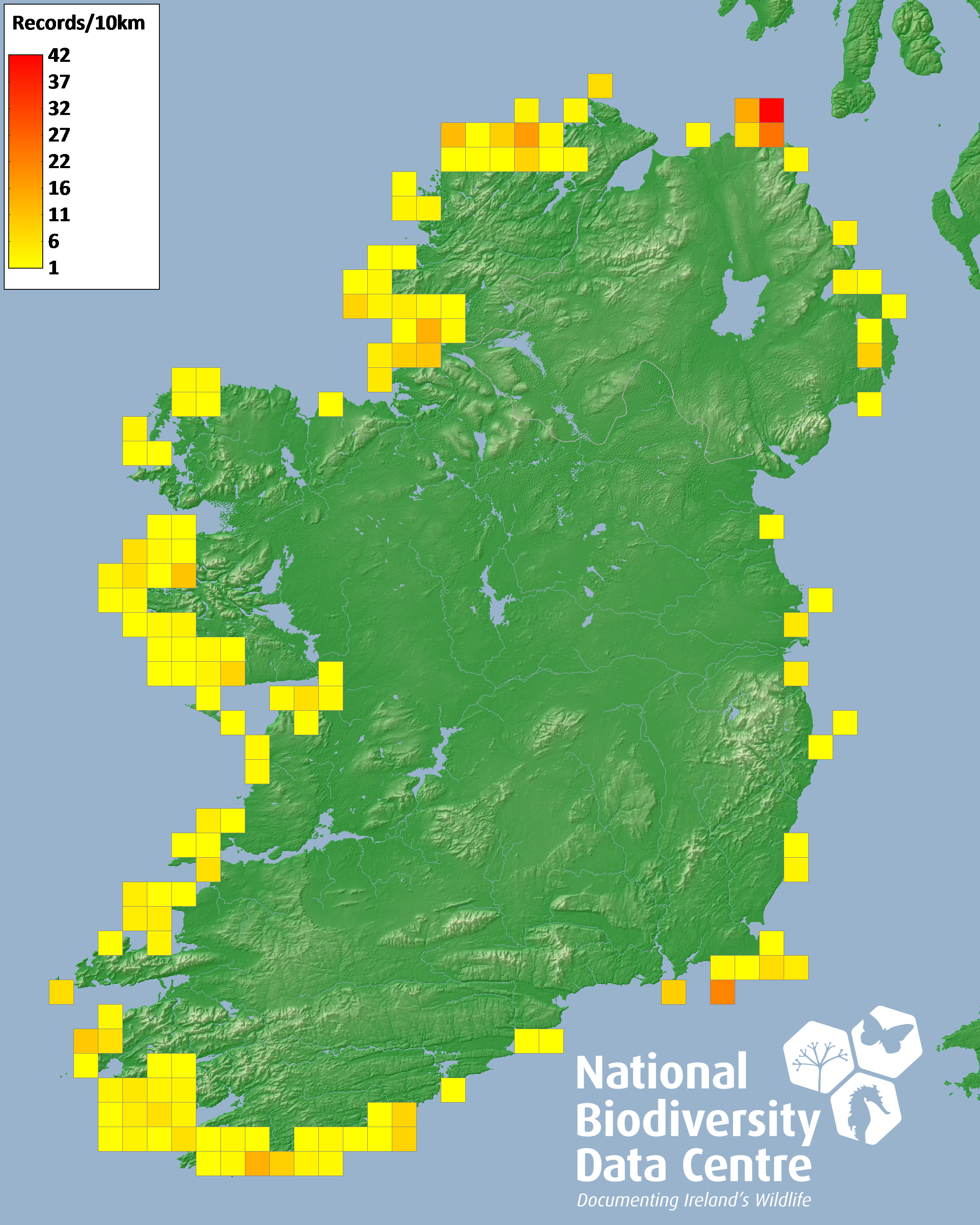 Distribution of the number of records recorded within each 10km grid square (ITM).Marine Map - 50km