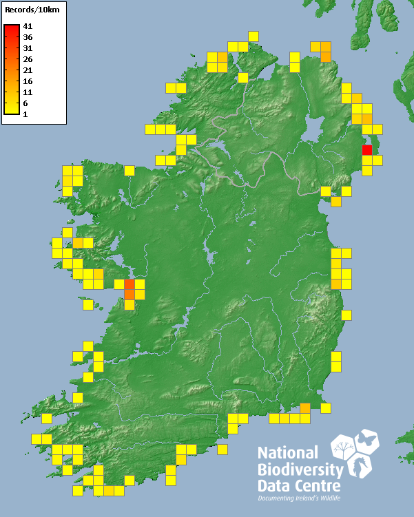 Distribution of the number of records recorded within each 10km grid square (ITM).Marine Map - 50km