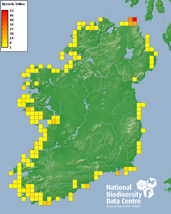 Distribution of the number of records recorded within each 10km grid square (ITM).Marine Map - 50km
