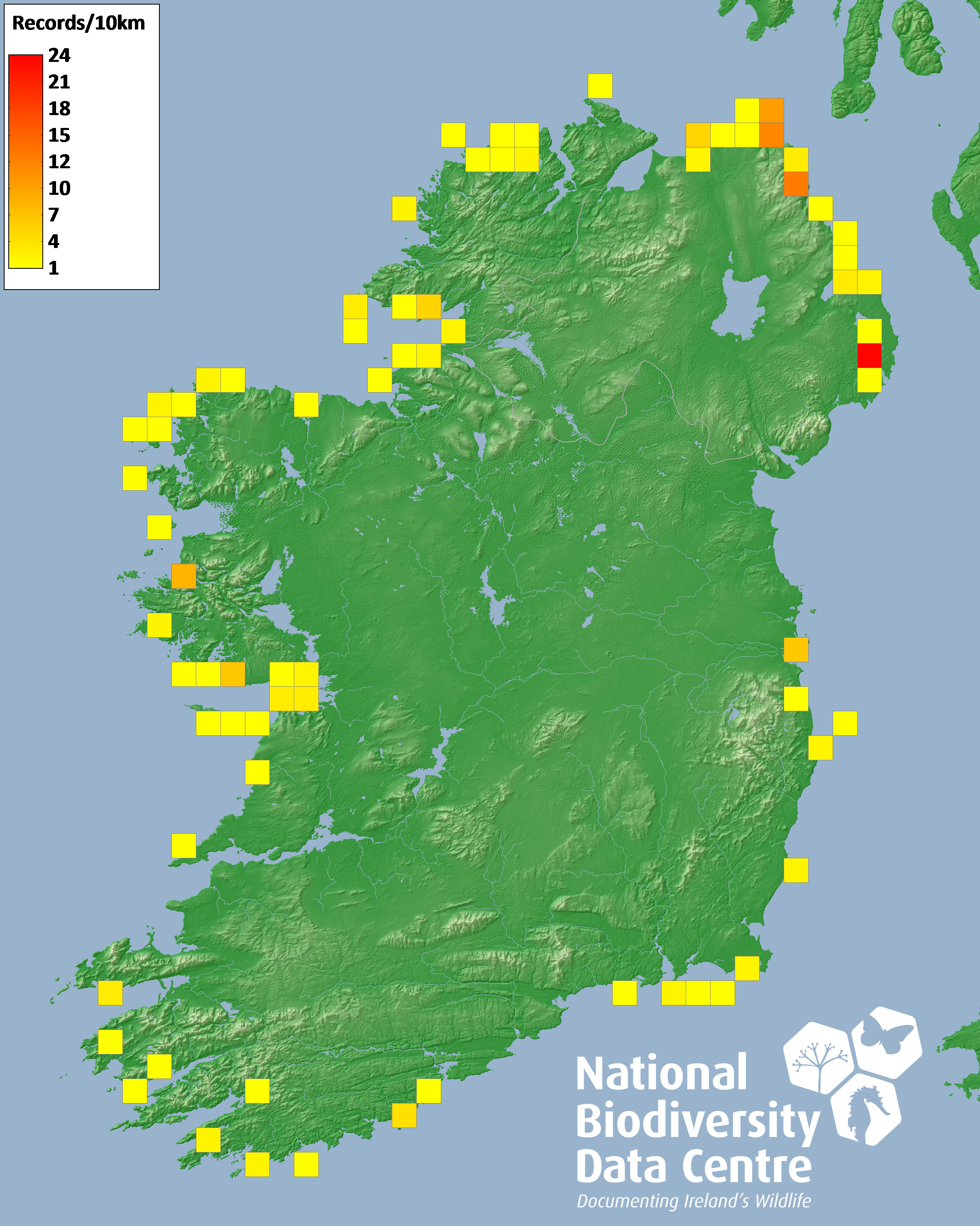 Distribution of the number of records recorded within each 10km grid square (ITM).Marine Map - 50km