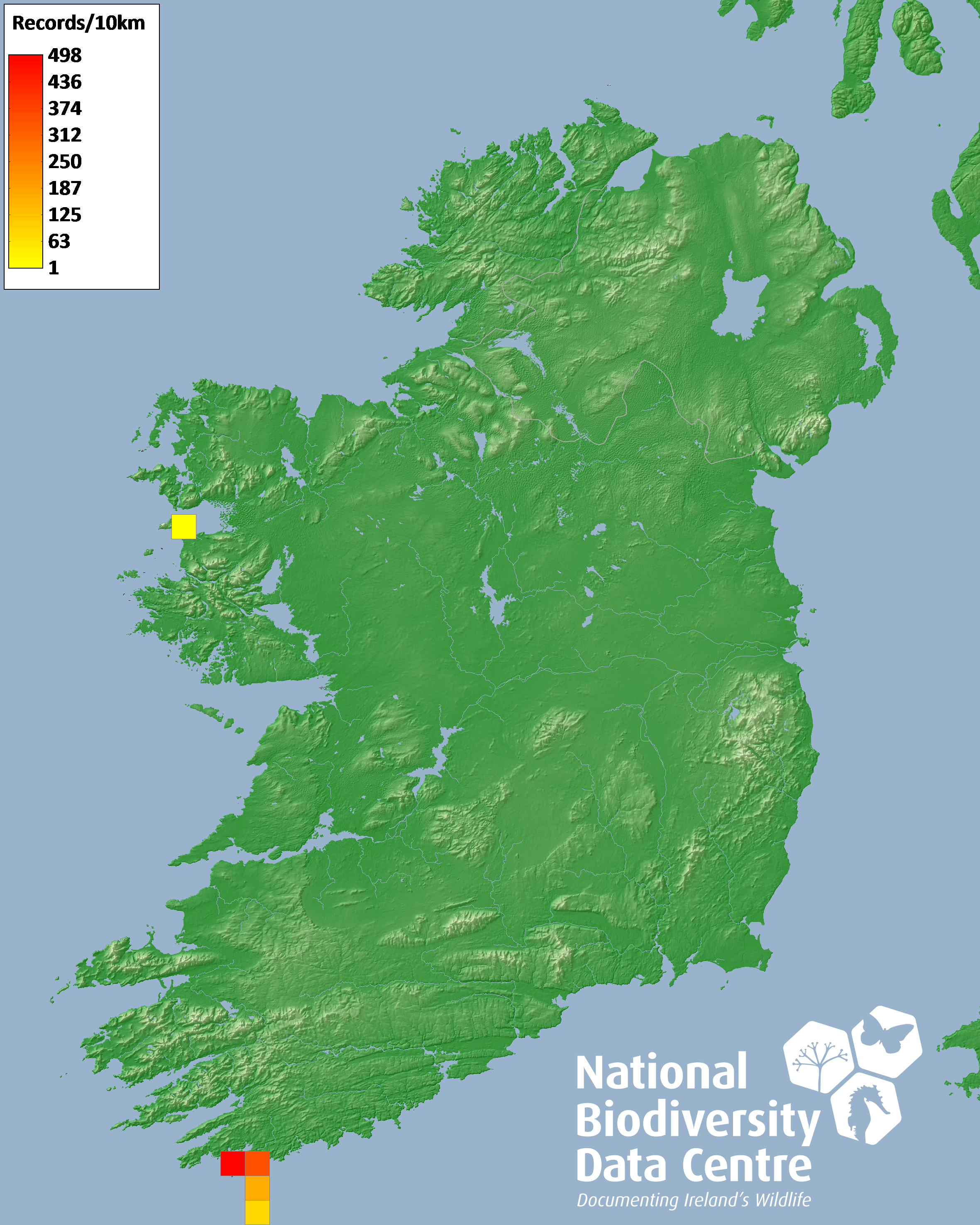 Distribution of the number of records recorded within each 10km grid square (ITM).Marine Map - 50km