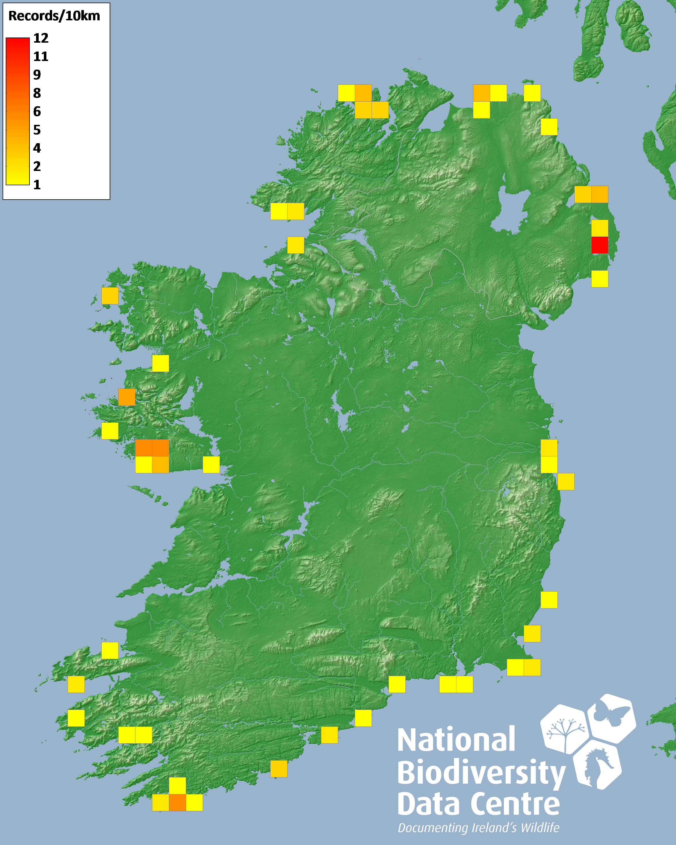 Distribution of the number of records recorded within each 10km grid square (ITM).Marine Map - 50km