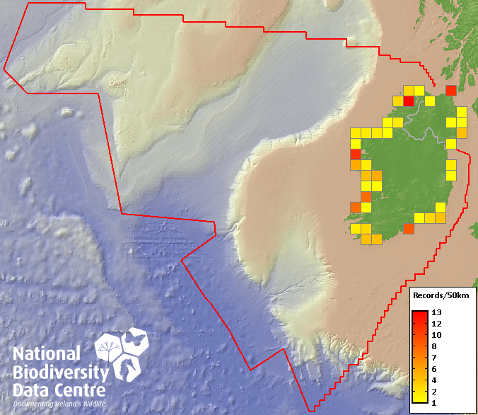 Distribution of the number of records recorded within each 10km grid square (ITM).Marine Map - 50km