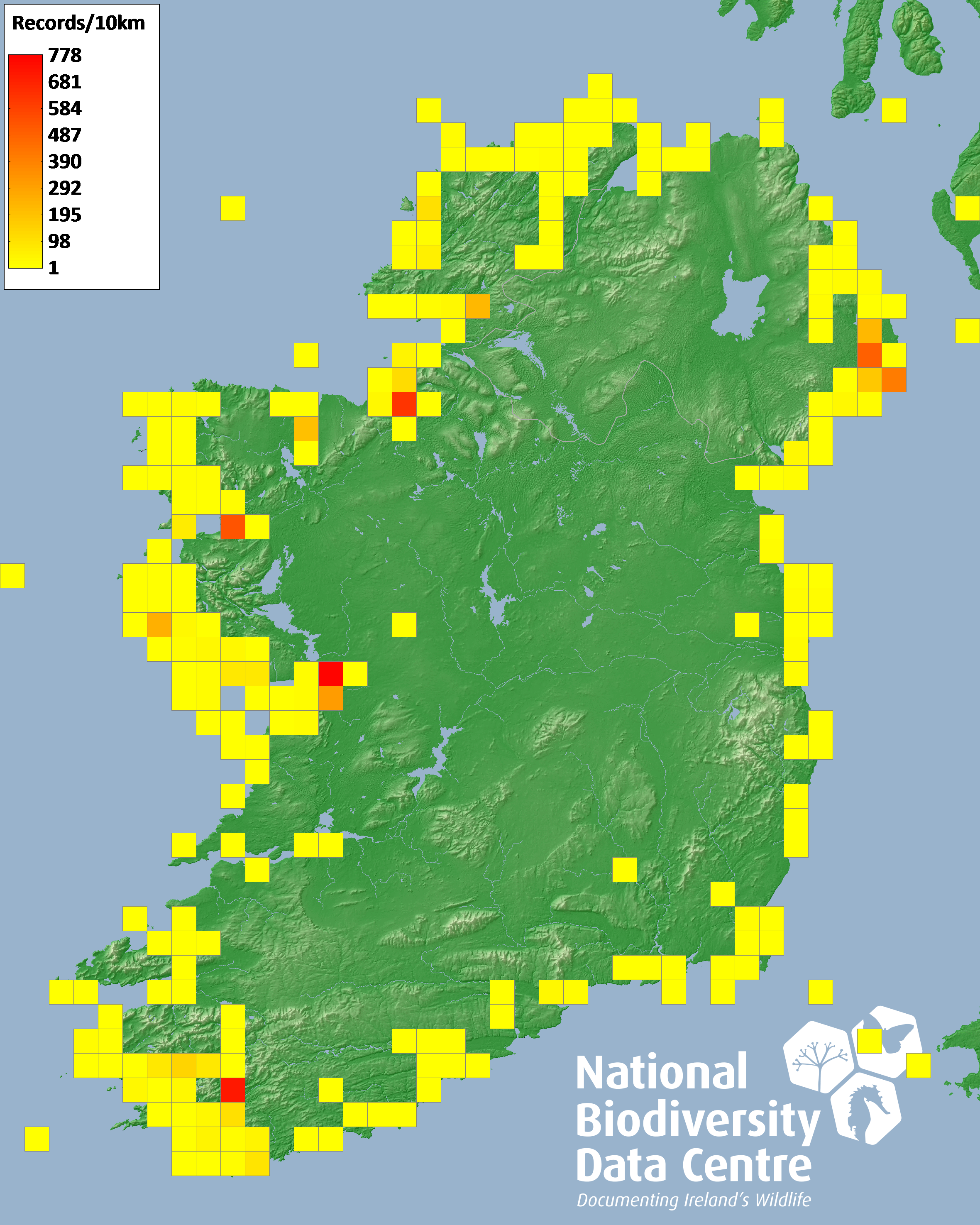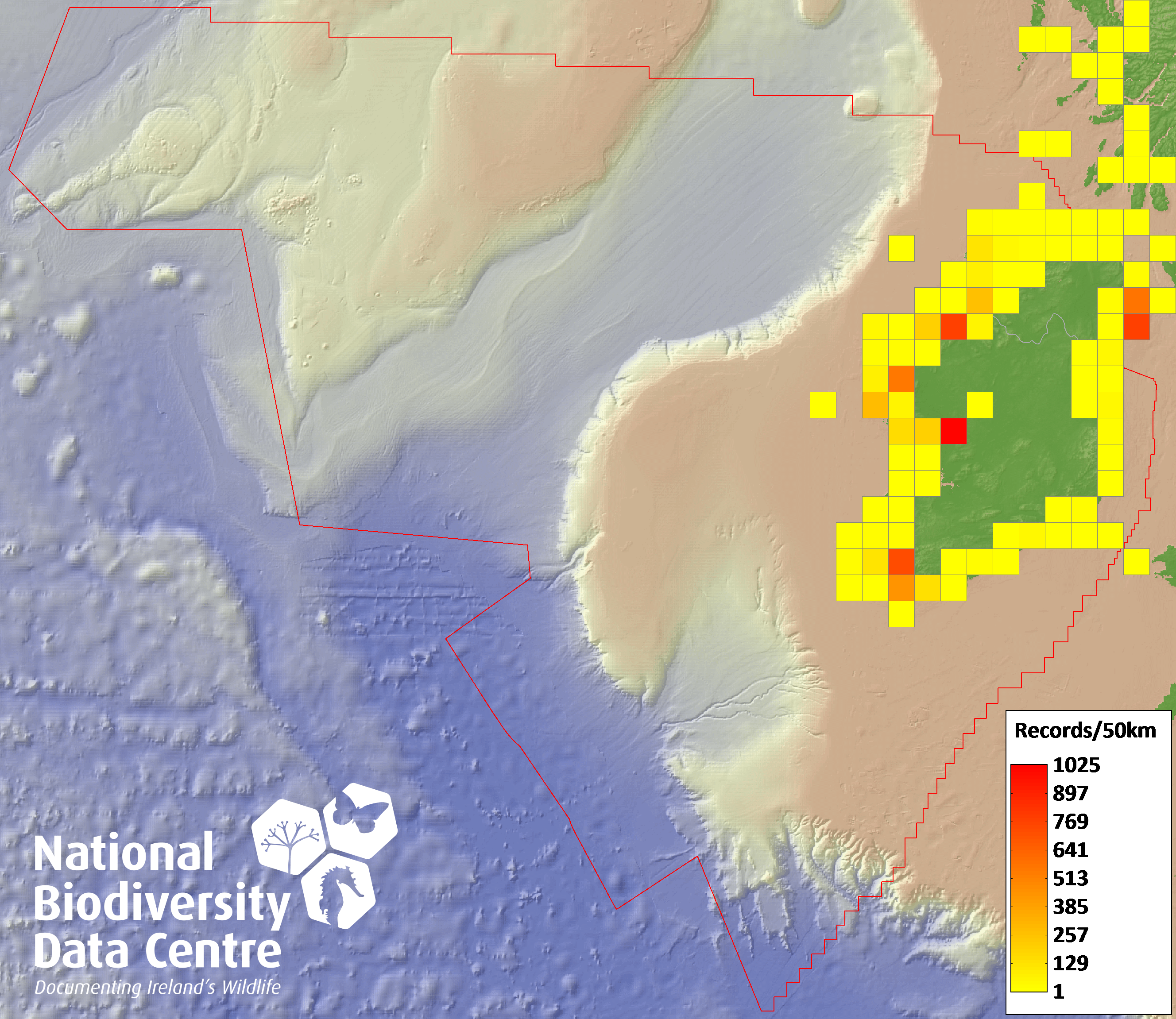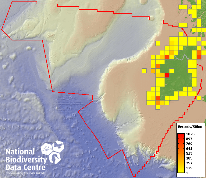 Distribution of the number of records recorded within each 10km grid square (ITM).Marine Map - 50km