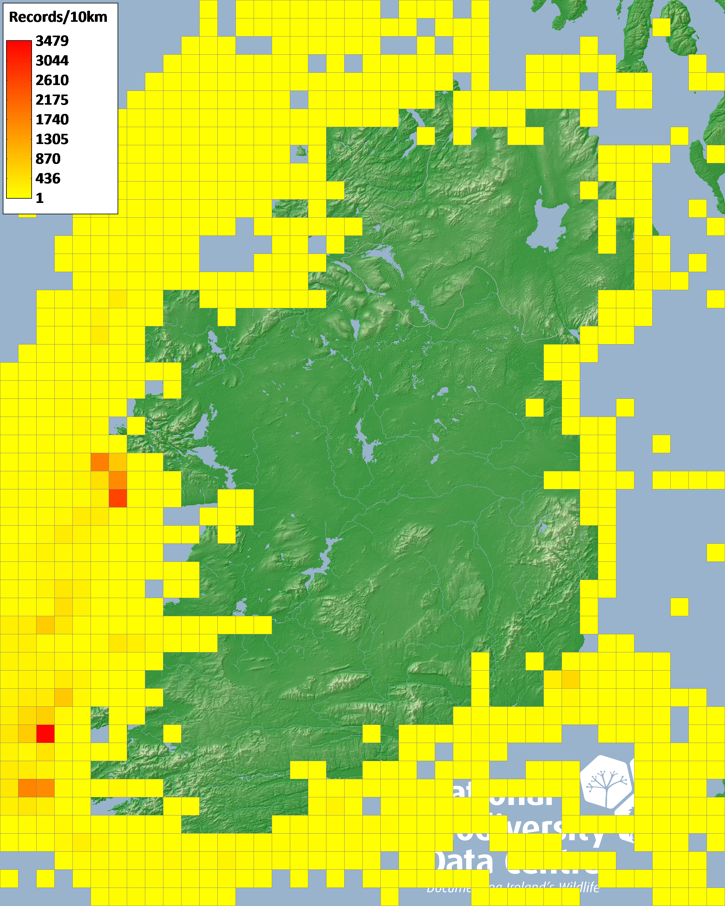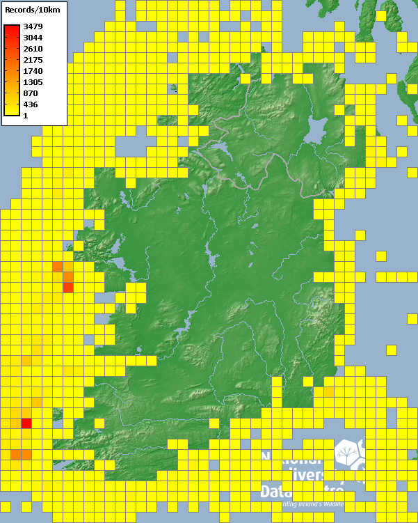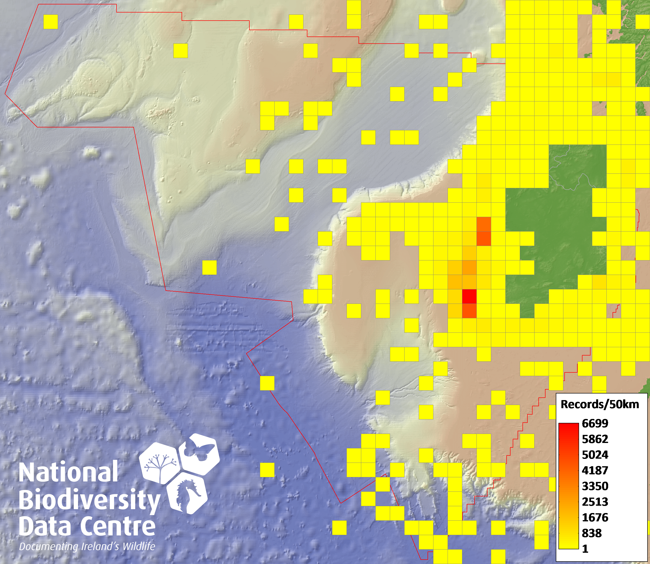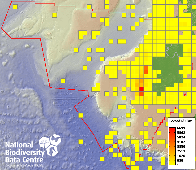 Distribution of the number of records recorded within each 10km grid square (ITM).Marine Map - 50km