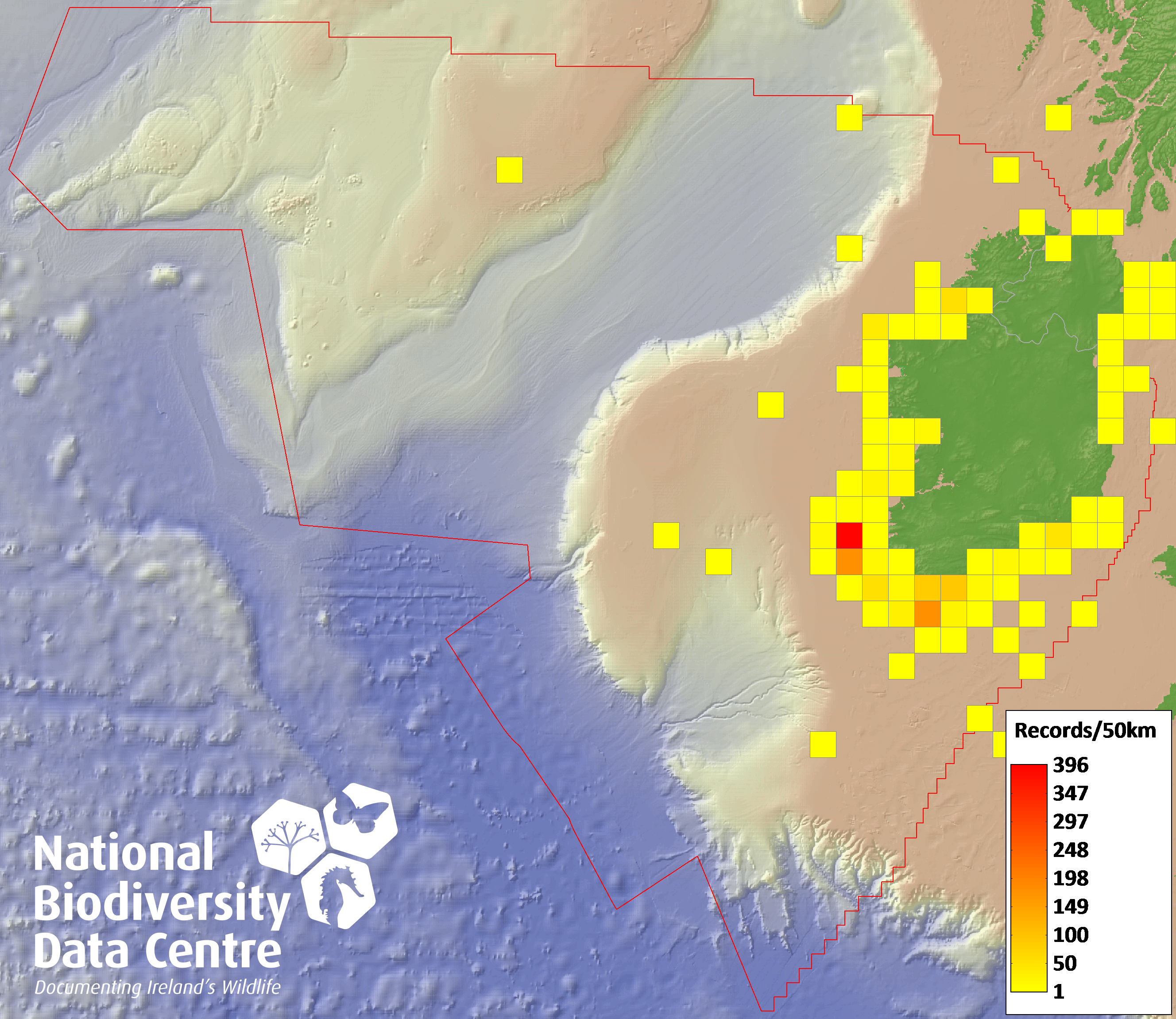 Distribution of the number of records recorded within each 10km grid square (ITM).Marine Map - 50km