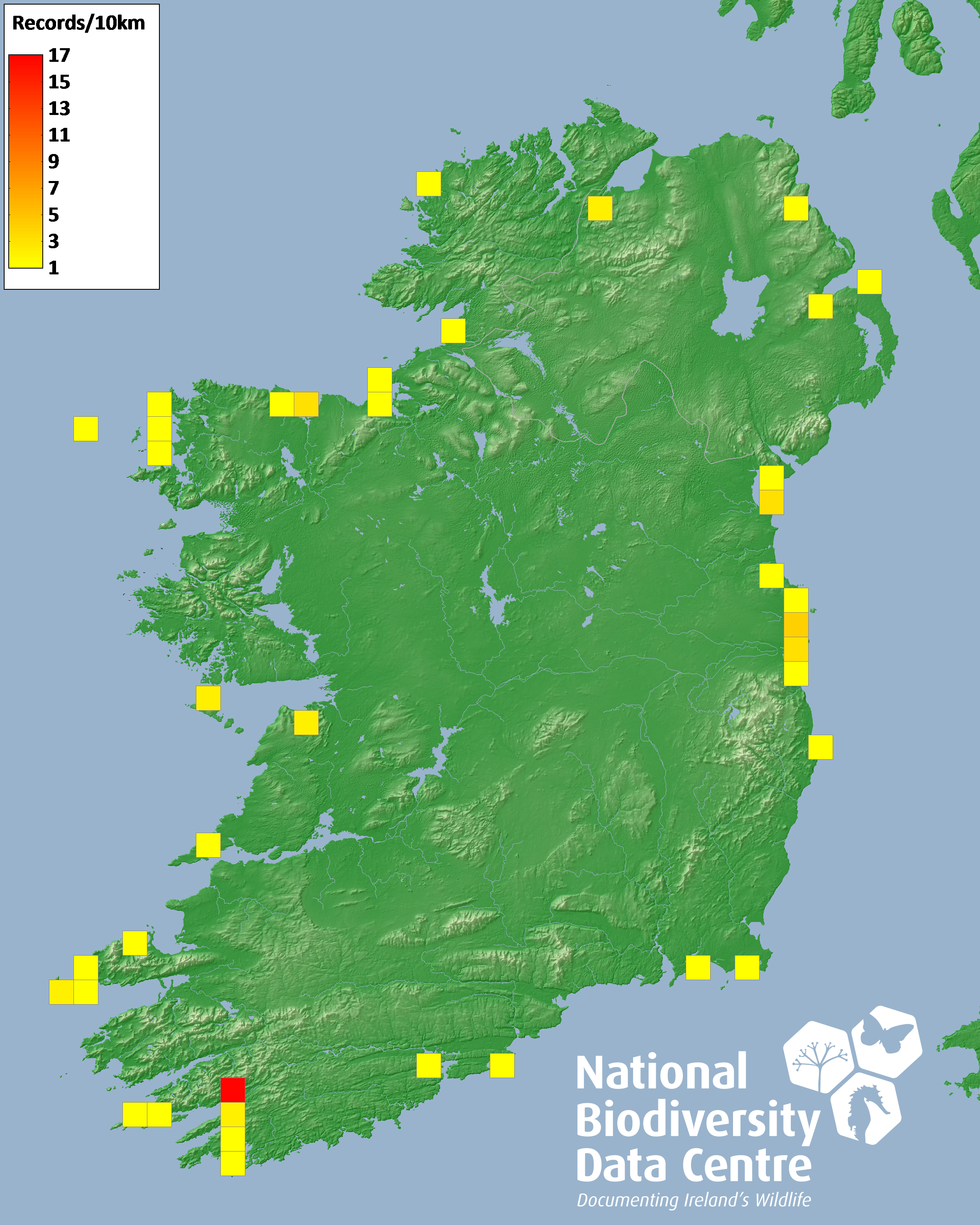 Distribution of the number of records recorded within each 10km grid square (ITM).Marine Map - 50km