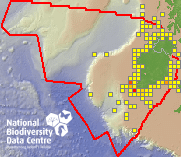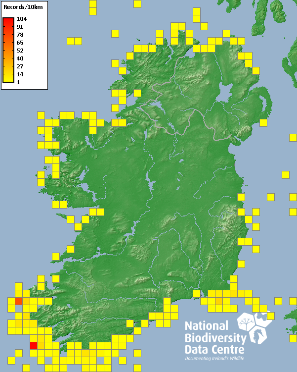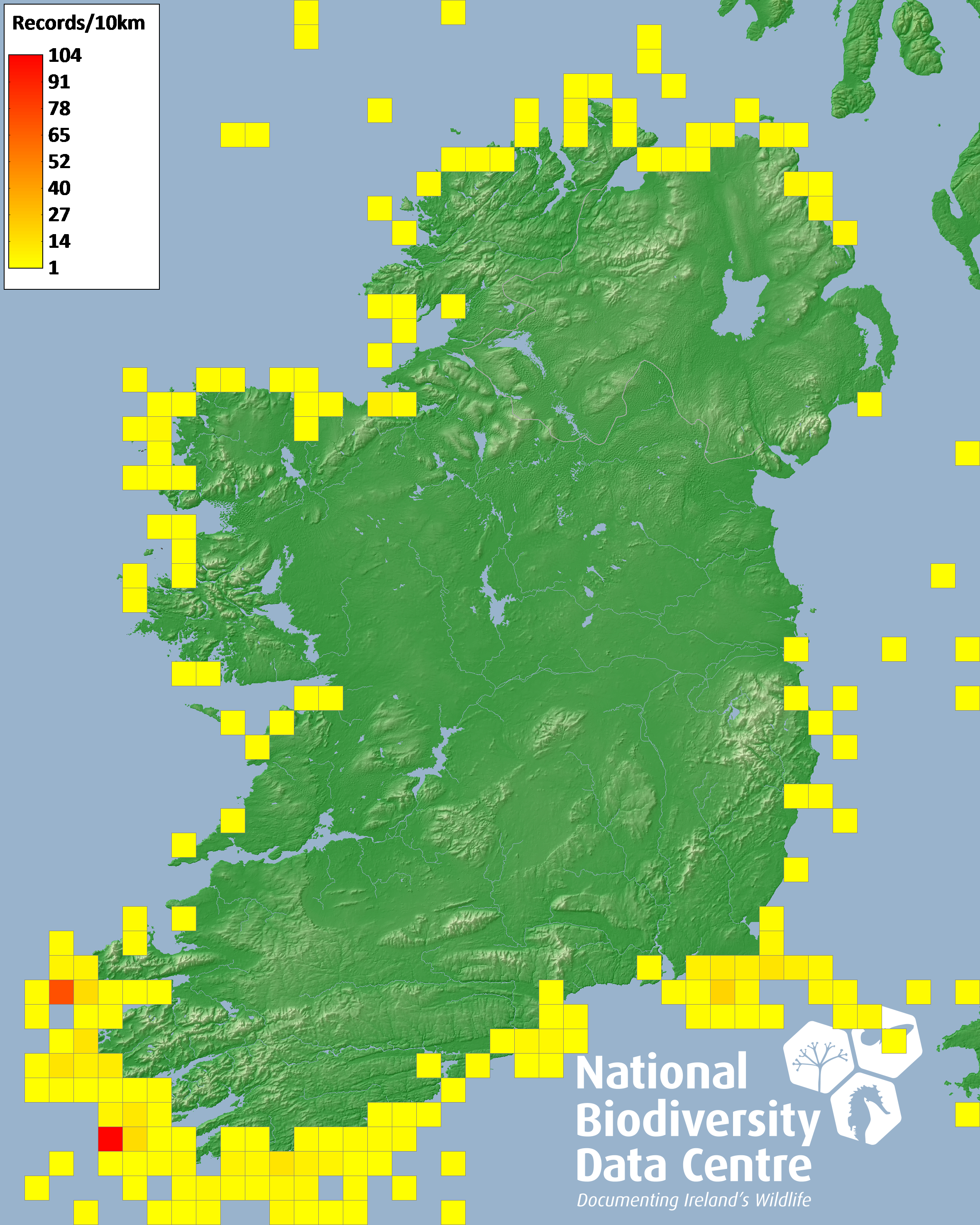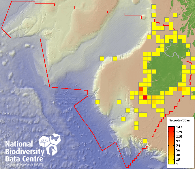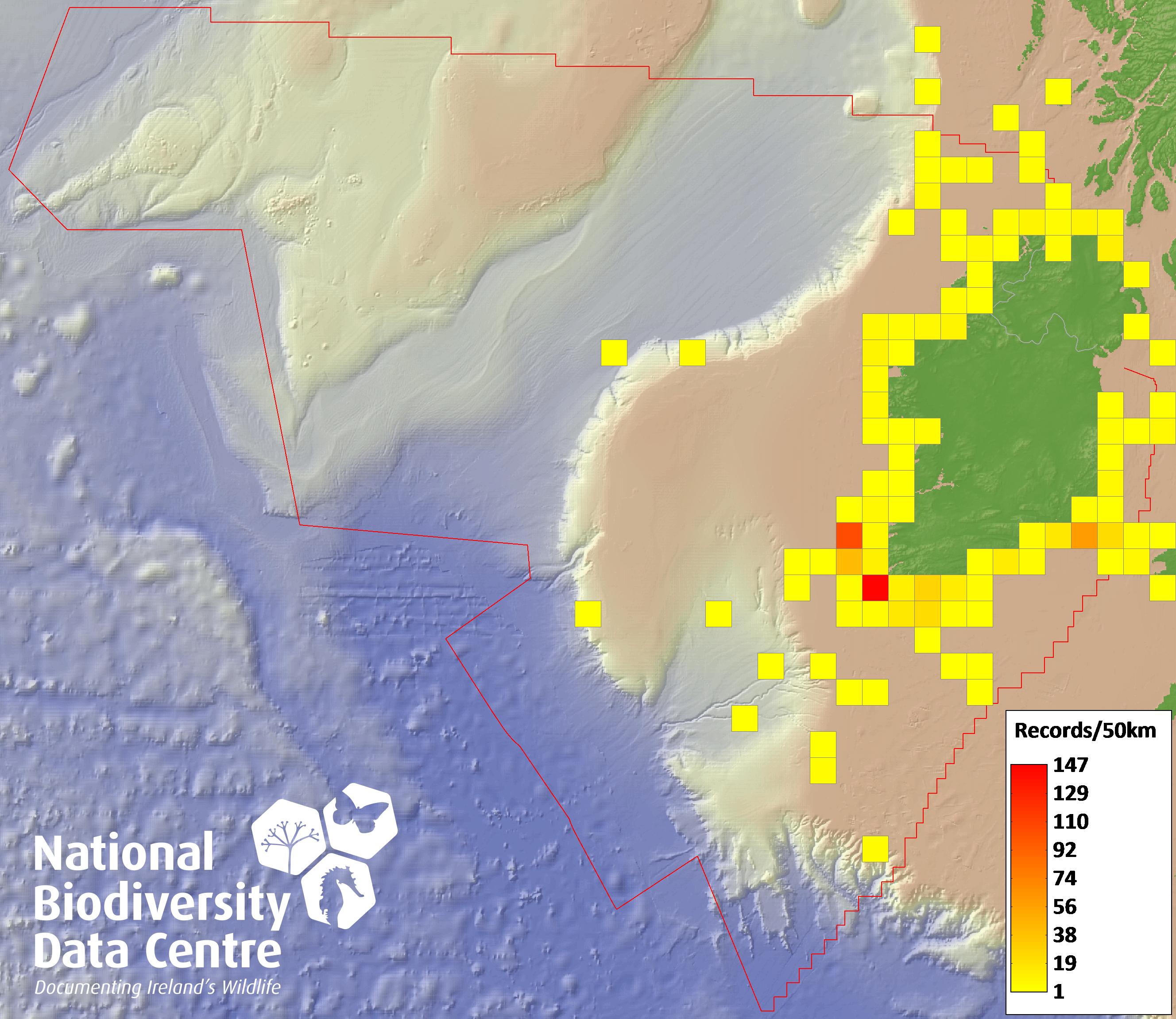 Distribution of the number of records recorded within each 10km grid square (ITM).Marine Map - 50km