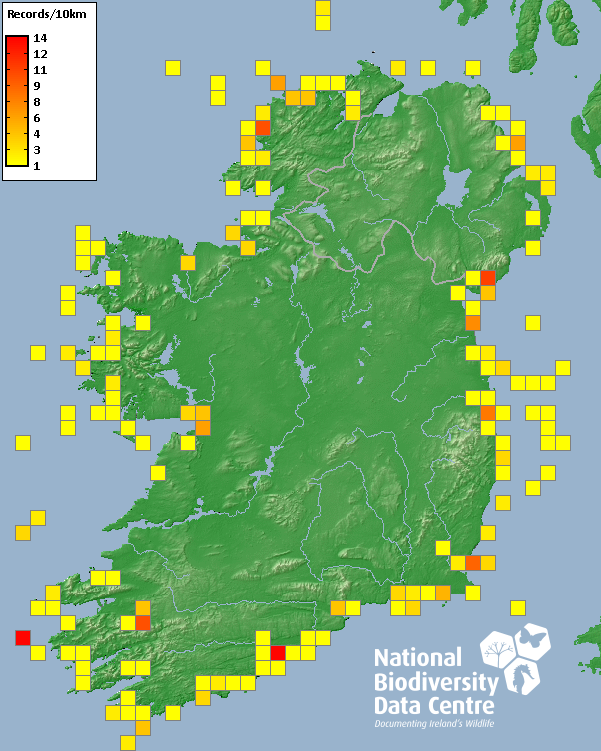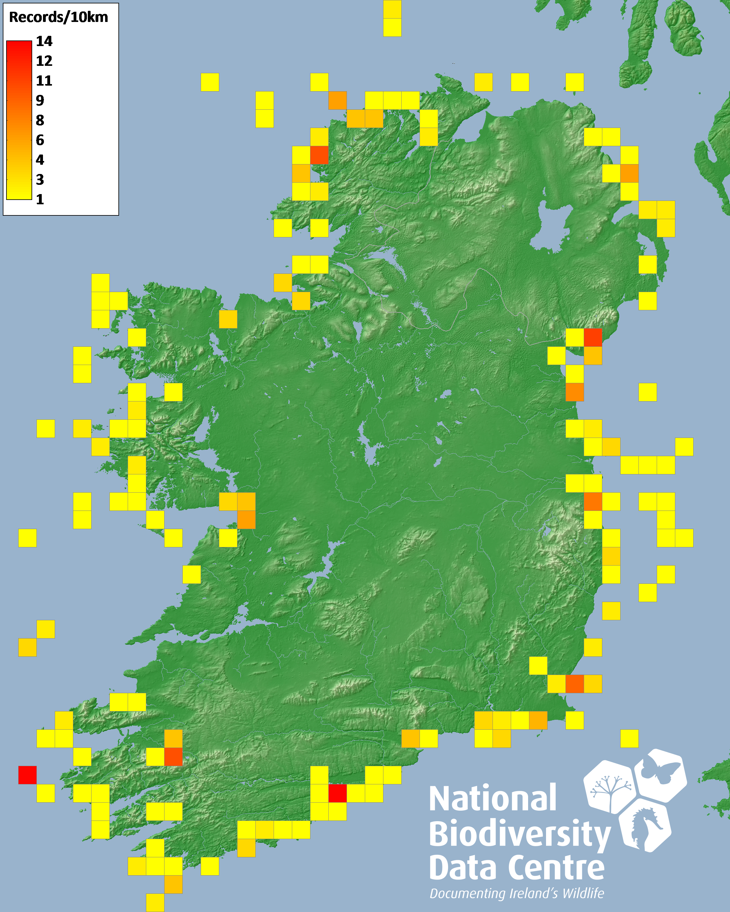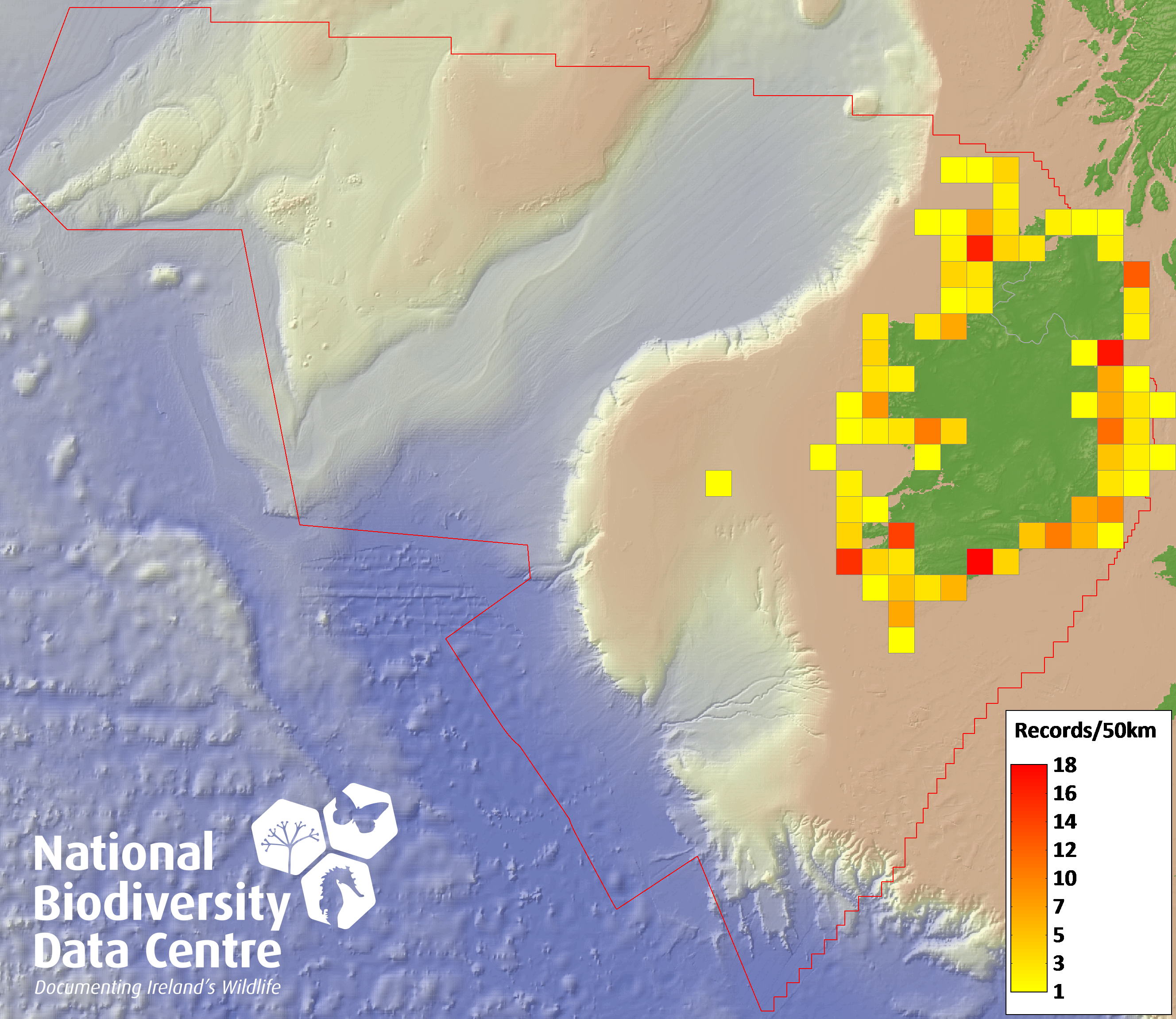Distribution of the number of records recorded within each 10km grid square (ITM).Marine Map - 50km
