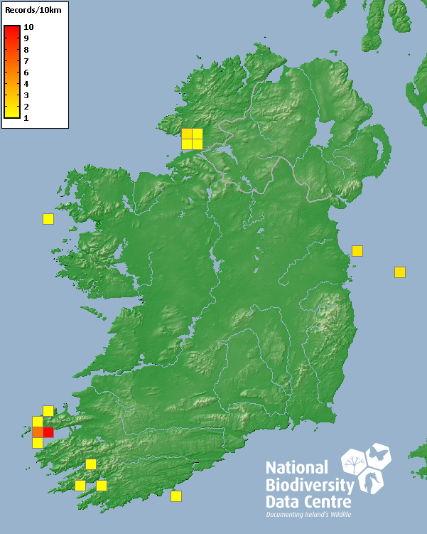 Distribution of the number of records recorded within each 10km grid square (ITM).Marine Map - 50km