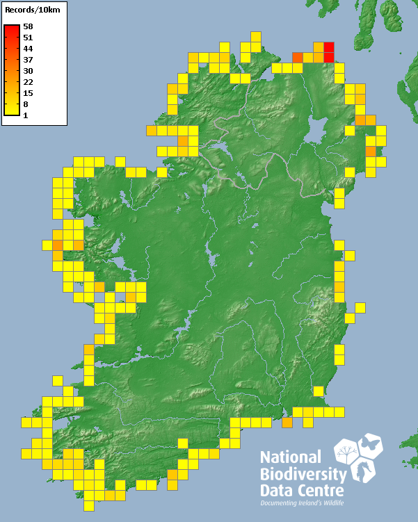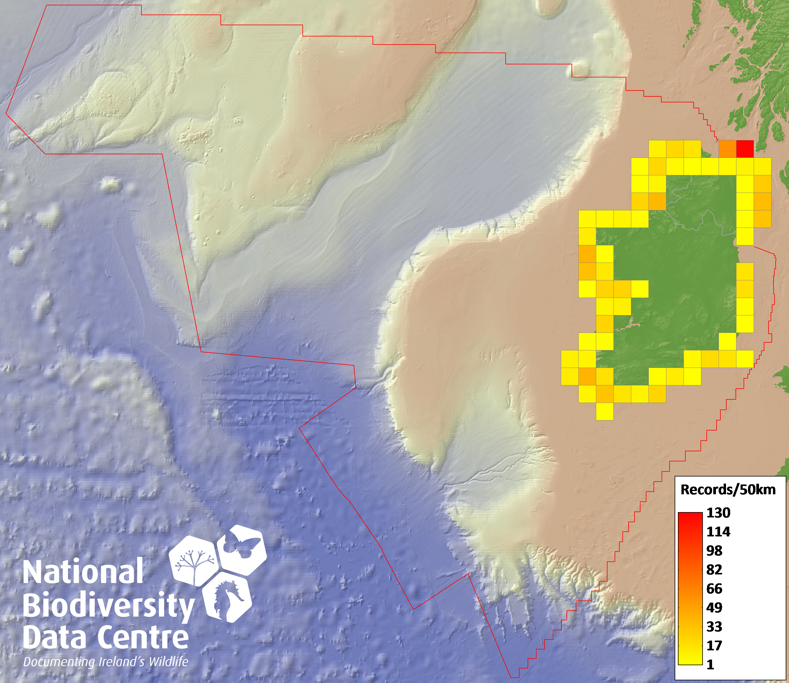 Distribution of the number of records recorded within each 10km grid square (ITM).Marine Map - 50km