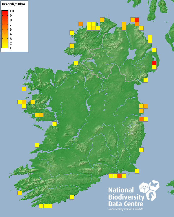 Distribution of the number of records recorded within each 10km grid square (ITM).Marine Map - 50km