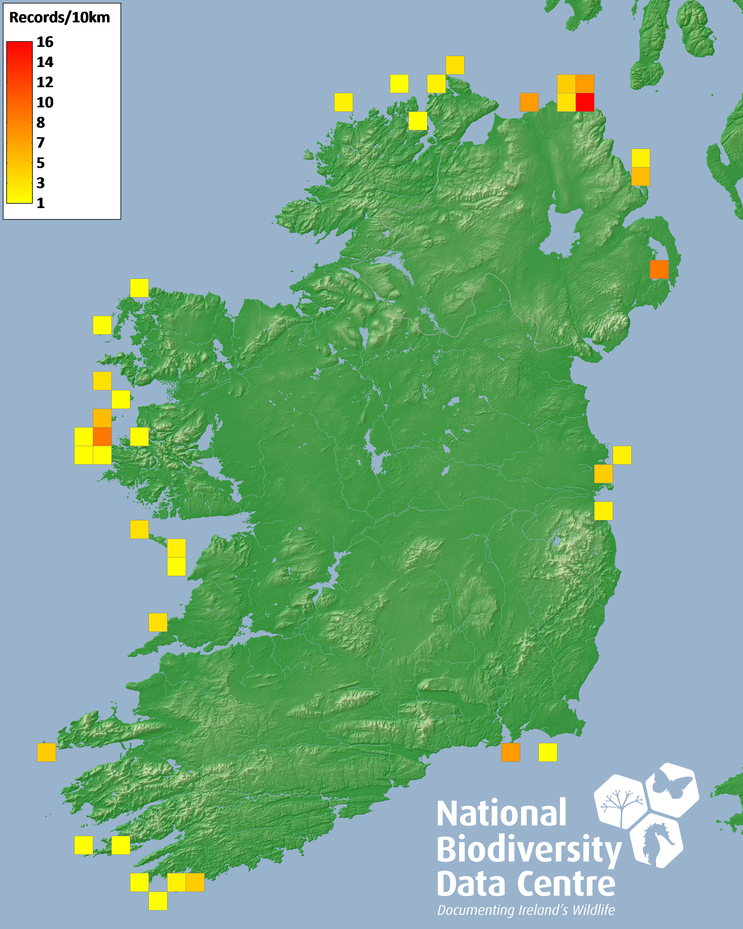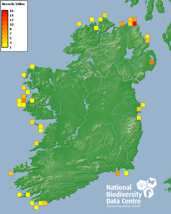 Distribution of the number of records recorded within each 10km grid square (ITM).Marine Map - 50km