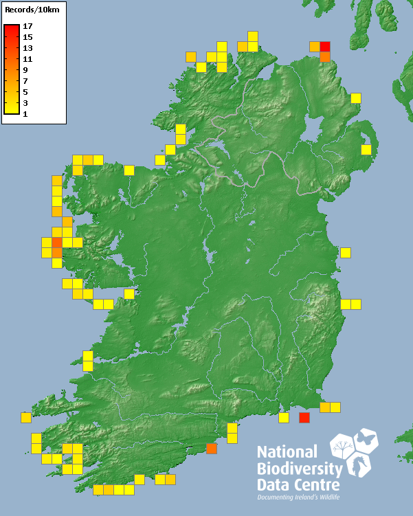 Distribution of the number of records recorded within each 10km grid square (ITM).Marine Map - 50km
