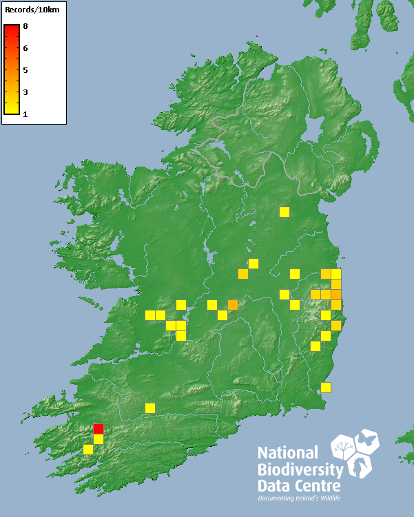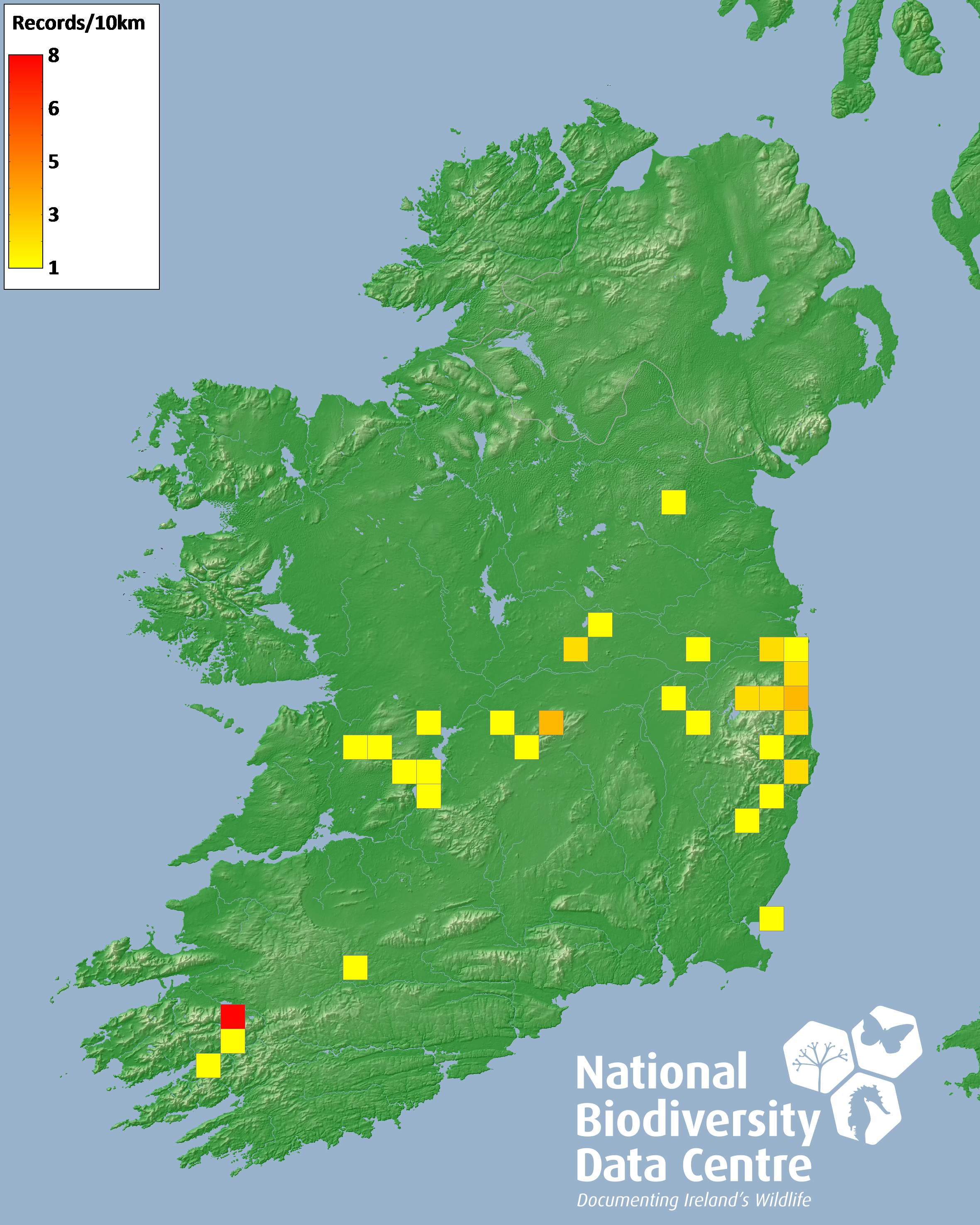 Distribution of the number of records recorded within each 10km grid square (ITM).Marine Map - 50km