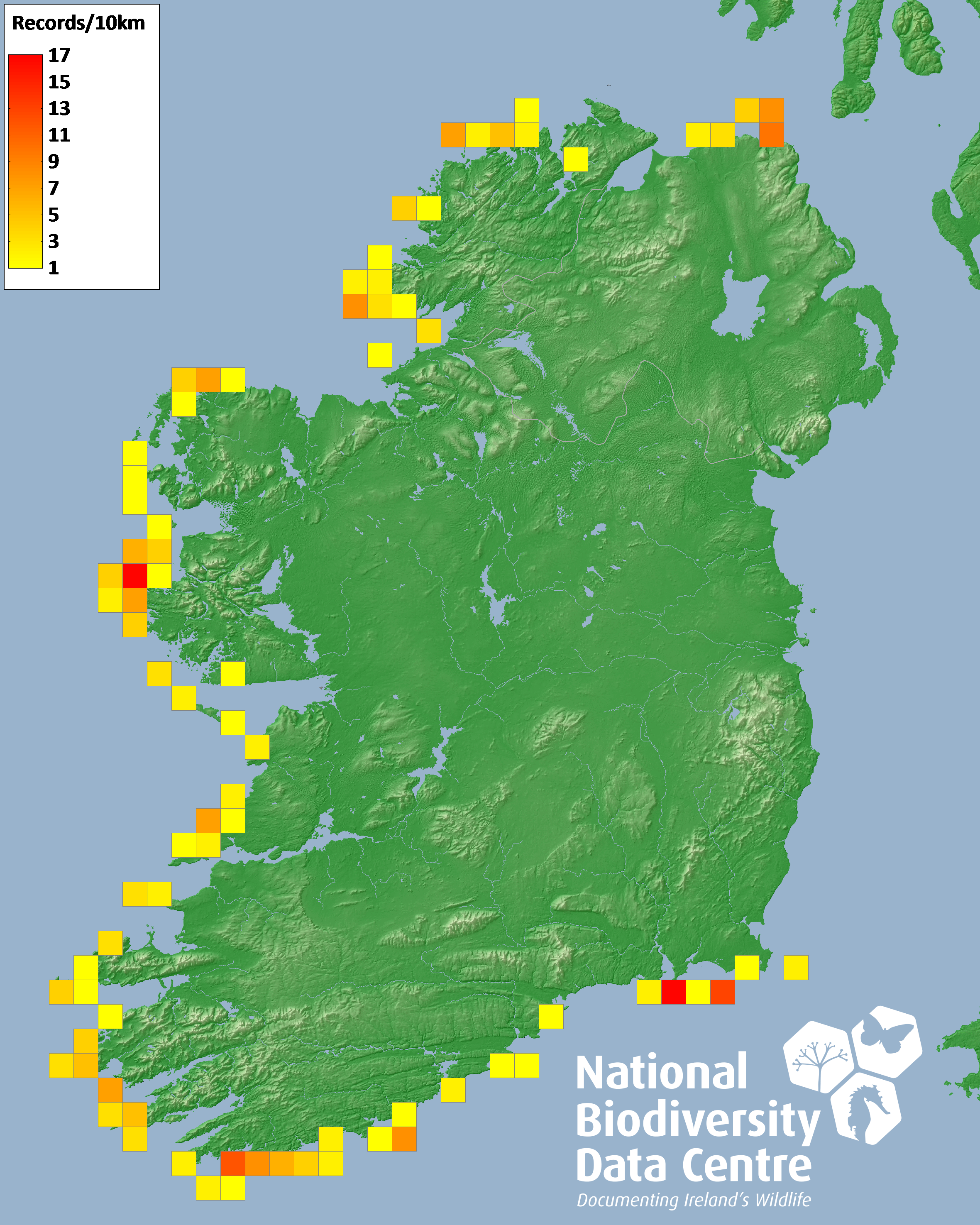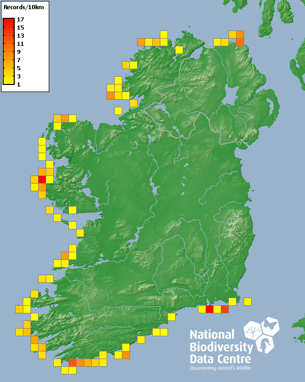 Distribution of the number of records recorded within each 10km grid square (ITM).Marine Map - 50km