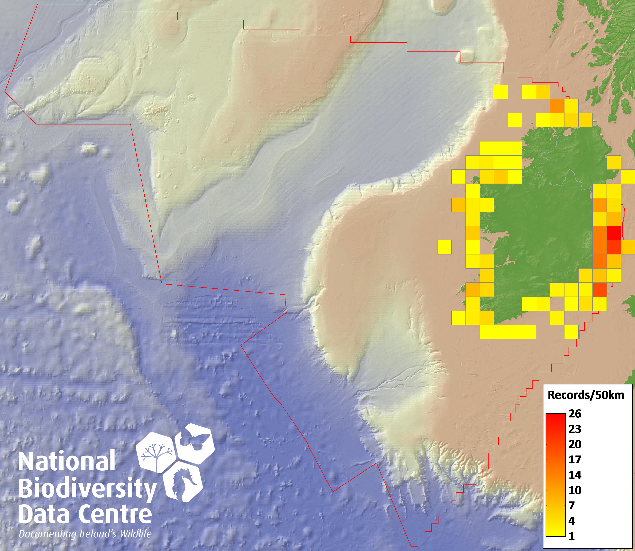 Distribution of the number of records recorded within each 10km grid square (ITM).Marine Map - 50km