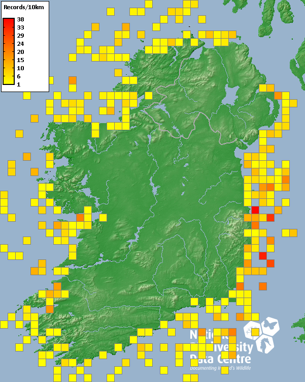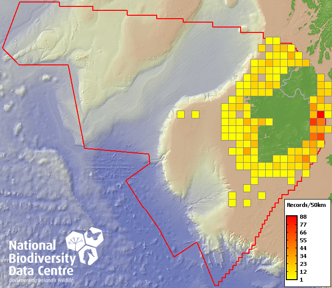 Distribution of the number of records recorded within each 10km grid square (ITM).Marine Map - 50km