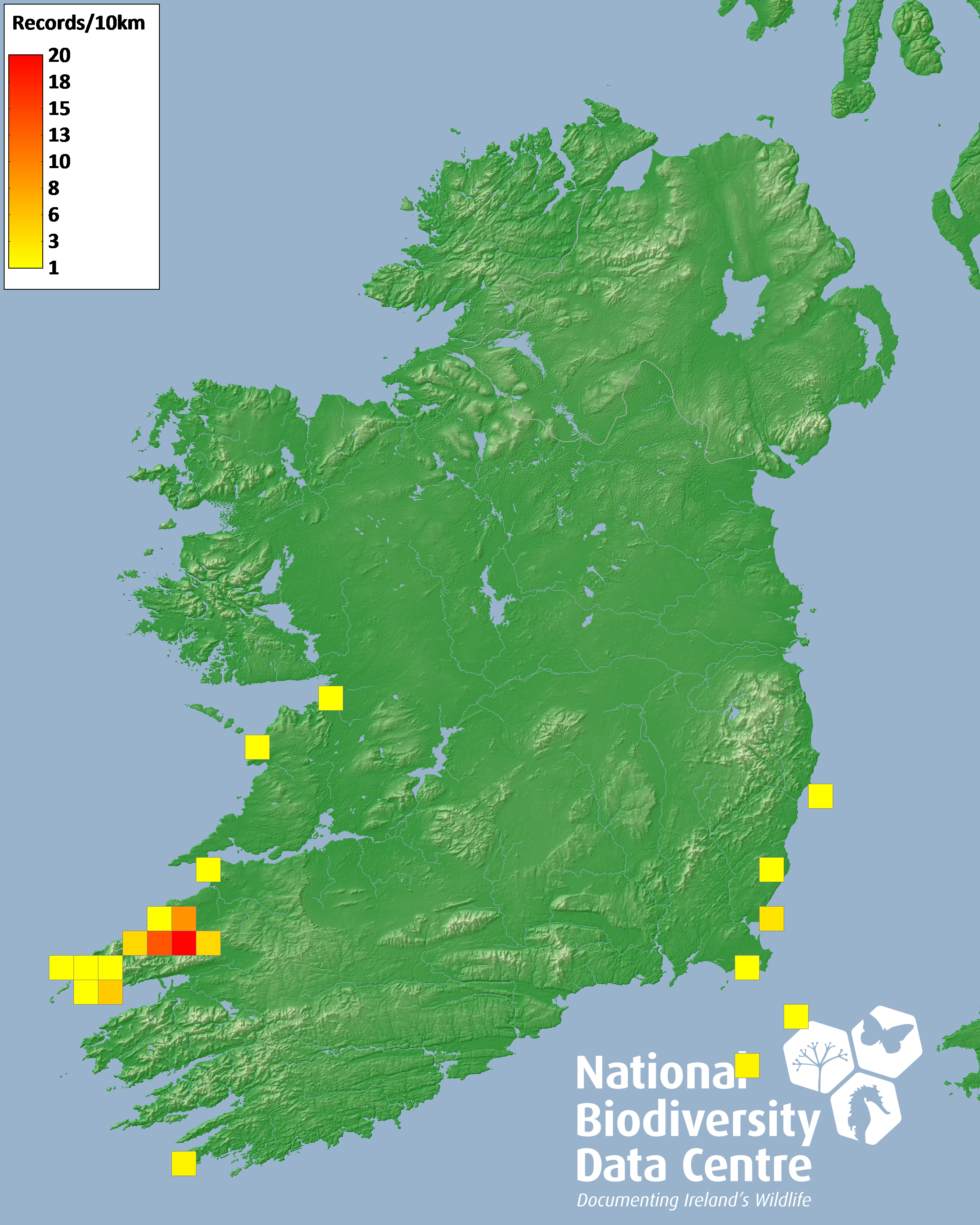 Distribution of the number of records recorded within each 10km grid square (ITM).Marine Map - 50km