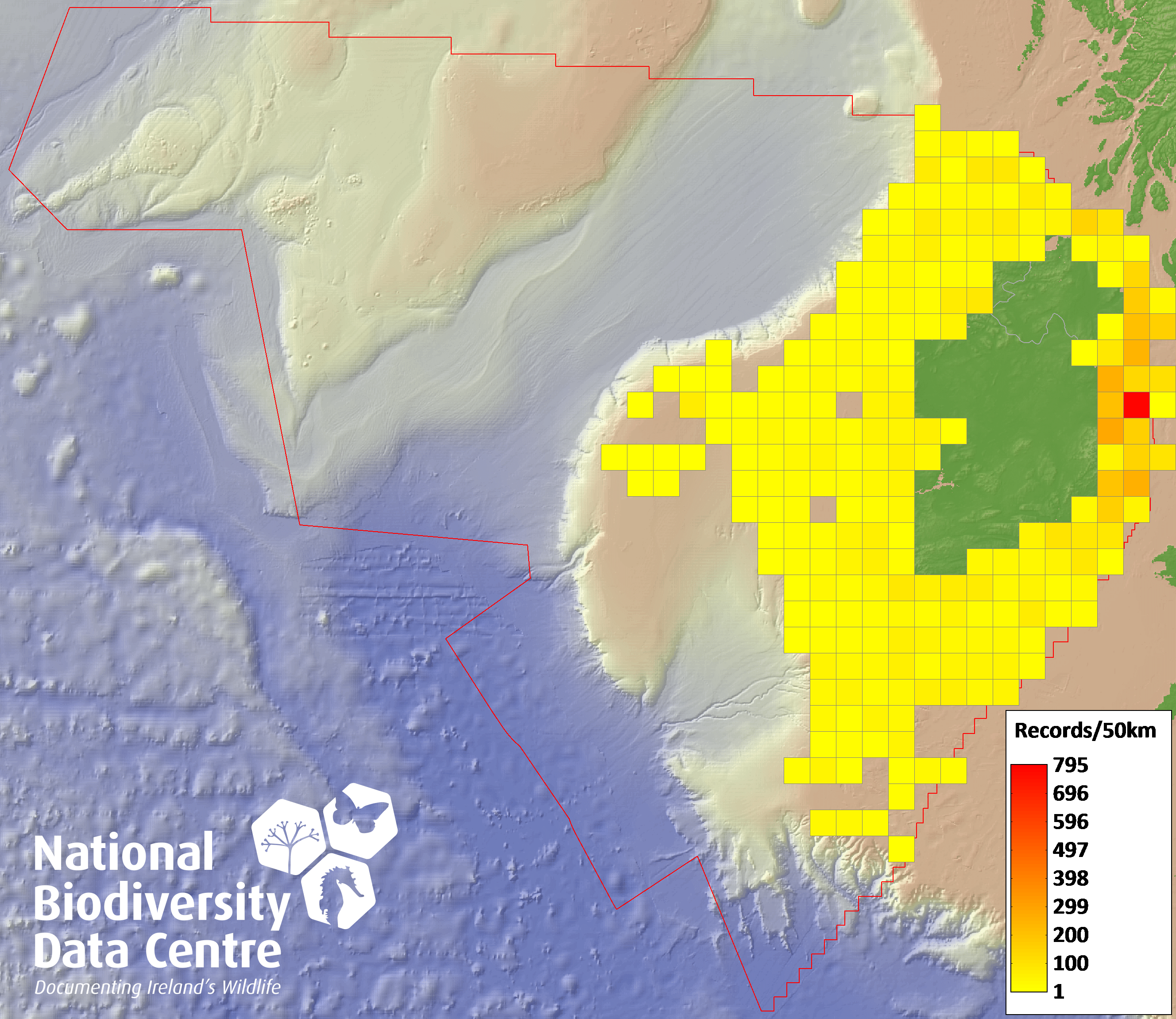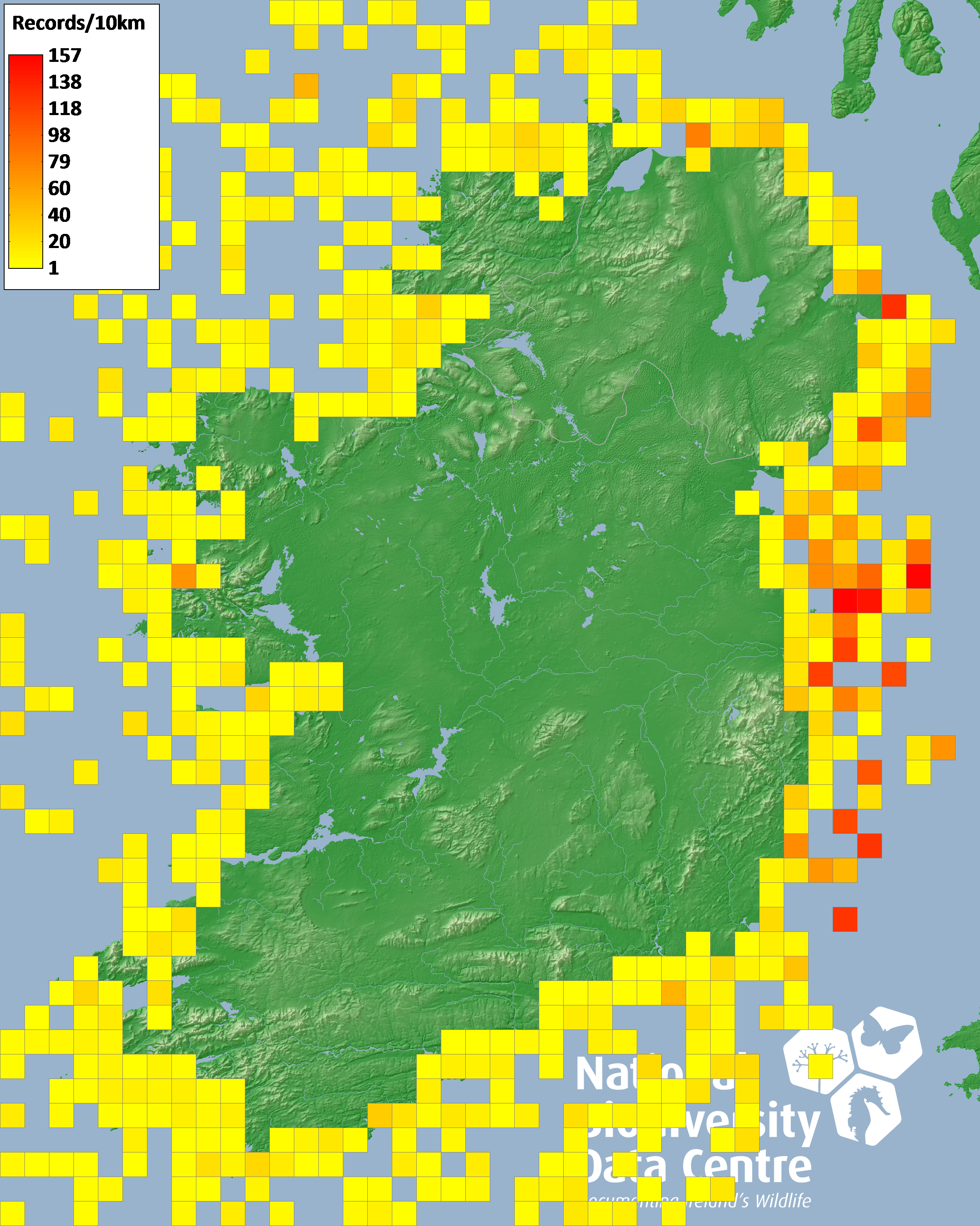 Distribution of the number of records recorded within each 10km grid square (ITM).Marine Map - 50km