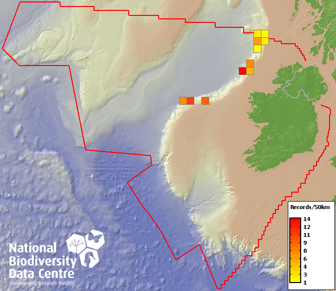 Distribution of the number of records recorded within each 10km grid square (ITM).Marine Map - 50km