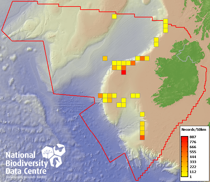Distribution of the number of records recorded within each 10km grid square (ITM).Marine Map - 50km