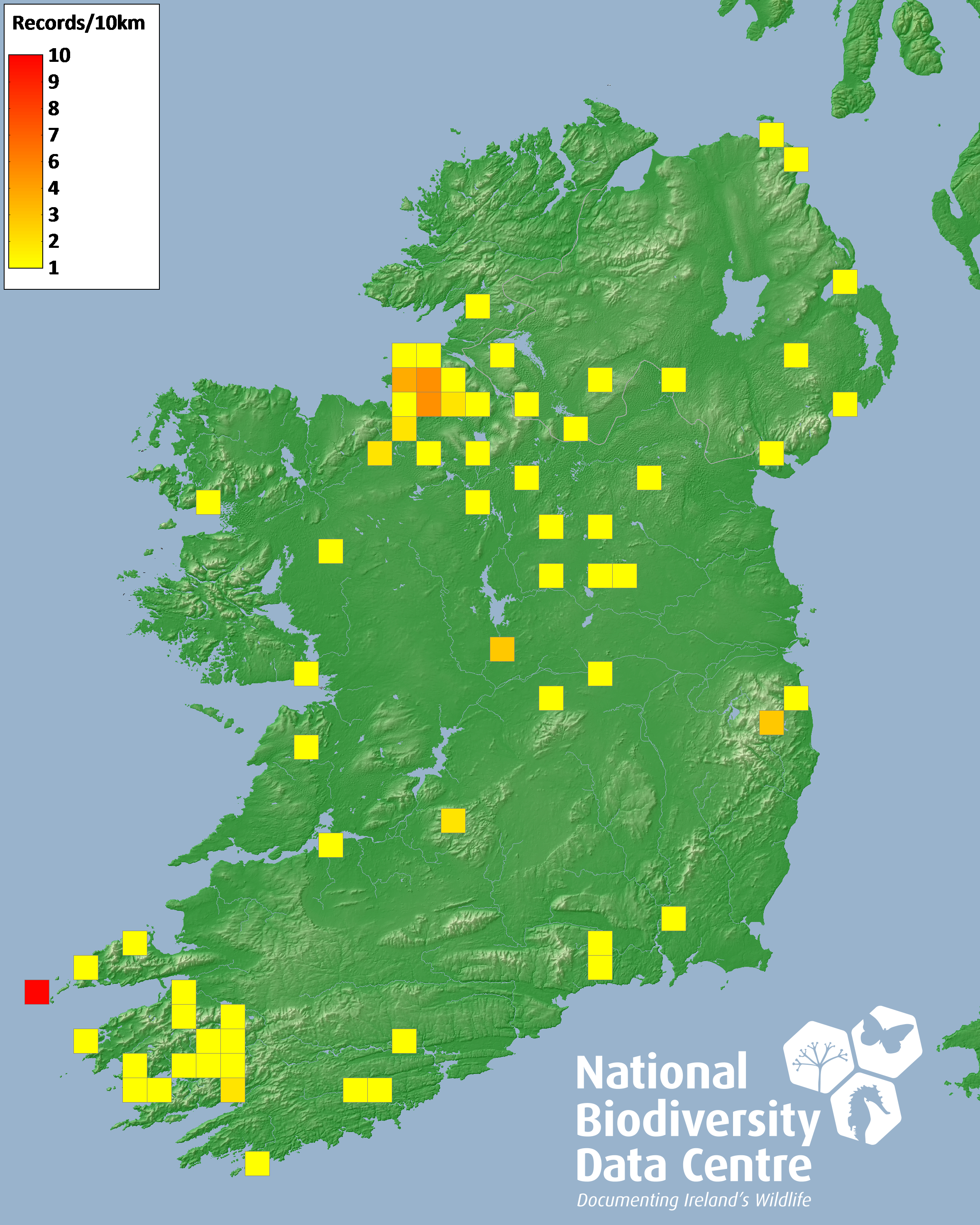 Distribution of the number of records recorded within each 10km grid square (ITM).Marine Map - 50km