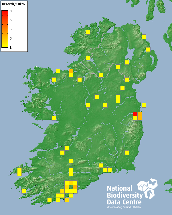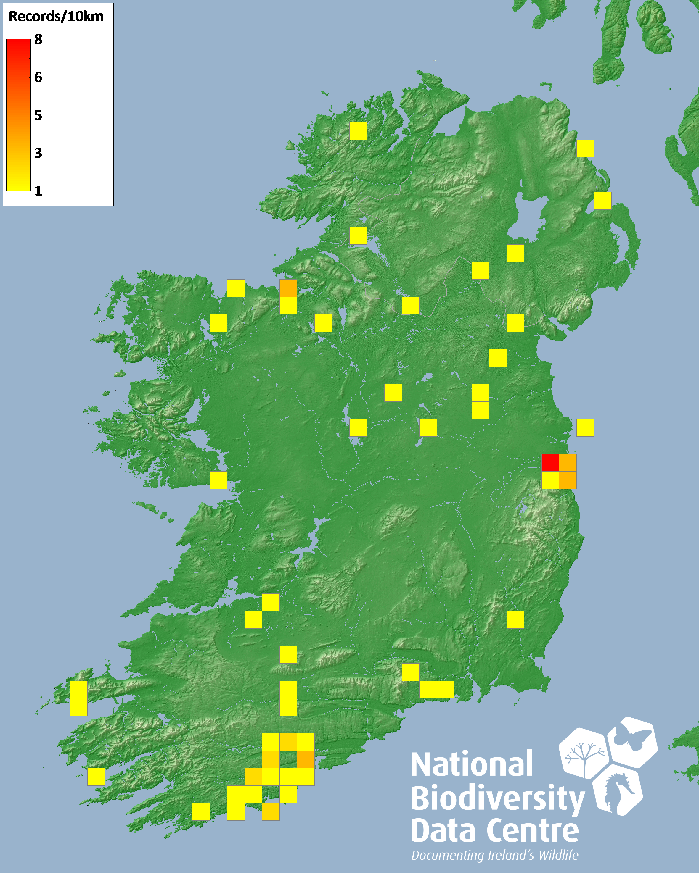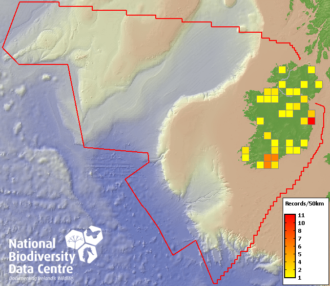 Distribution of the number of records recorded within each 10km grid square (ITM).Marine Map - 50km