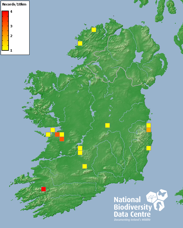 Distribution of the number of records recorded within each 10km grid square (ITM).Marine Map - 50km