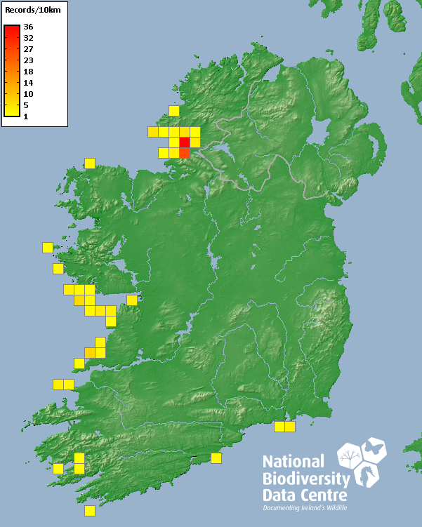 Distribution of the number of records recorded within each 10km grid square (ITM).Marine Map - 50km