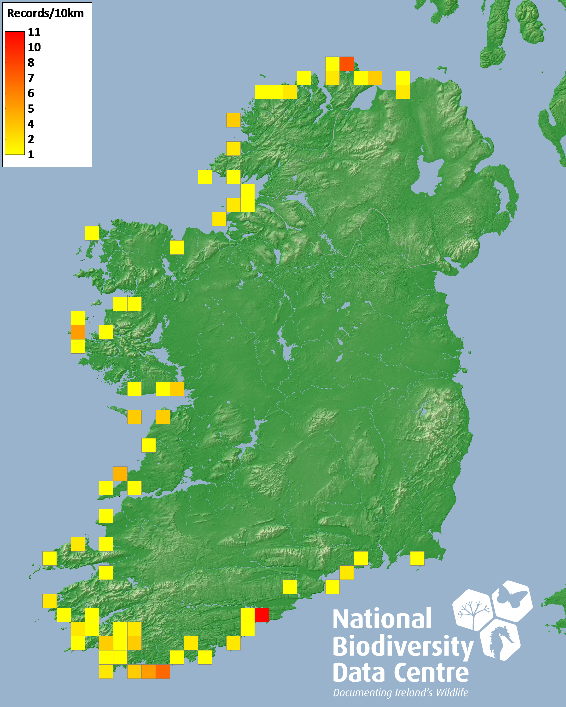 Distribution of the number of records recorded within each 10km grid square (ITM).Marine Map - 50km