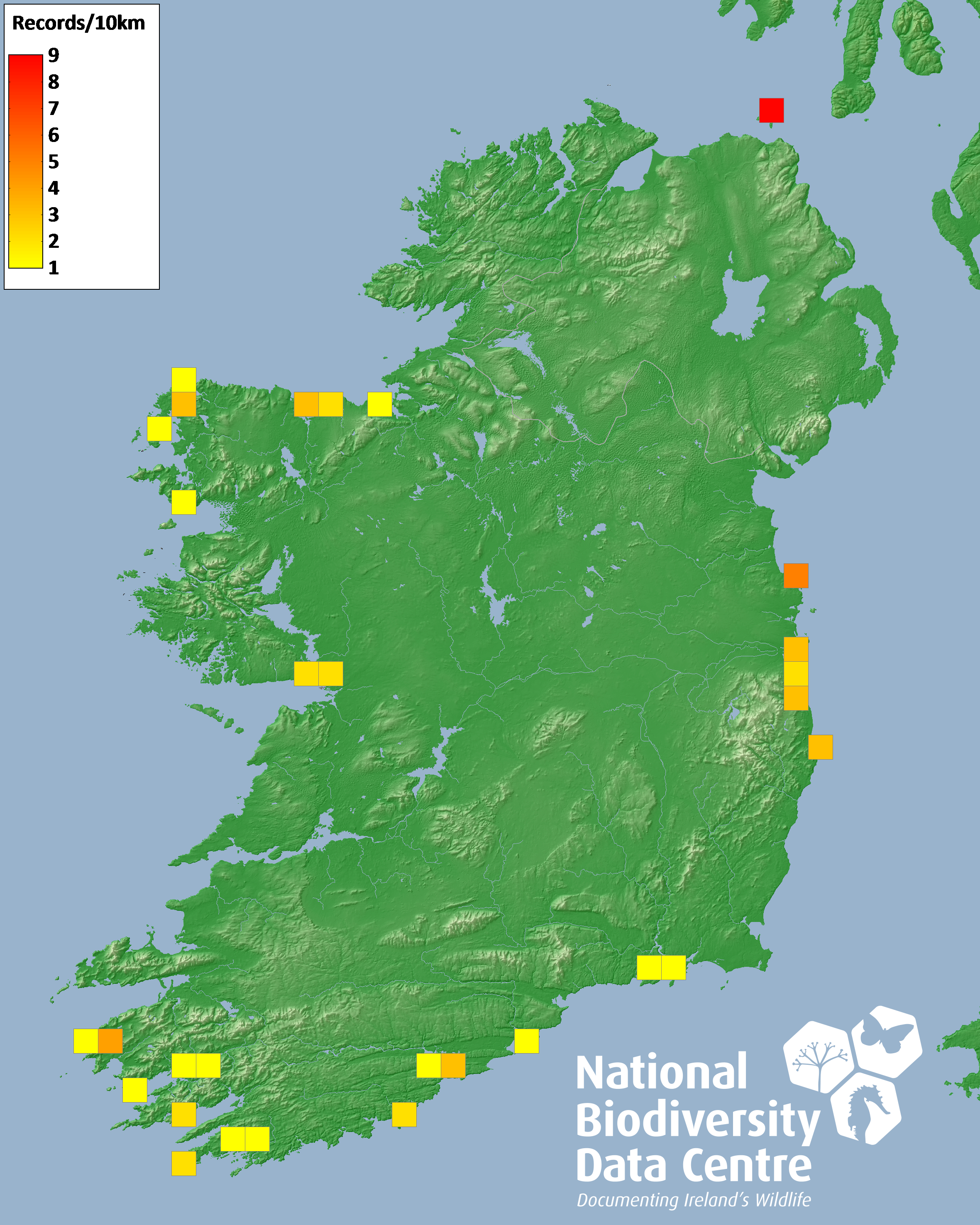 Distribution of the number of records recorded within each 10km grid square (ITM).Marine Map - 50km