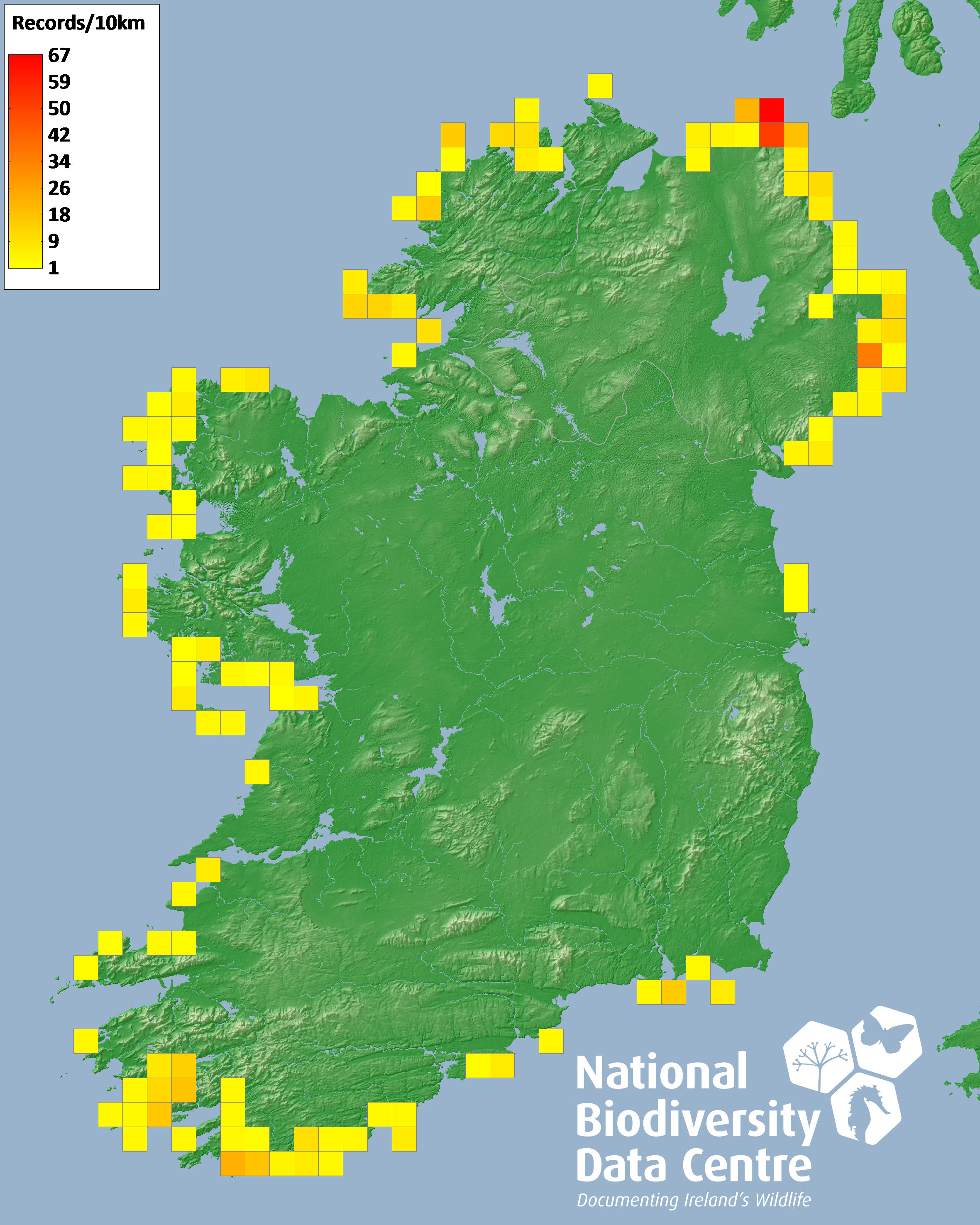 Distribution of the number of records recorded within each 10km grid square (ITM).Marine Map - 50km