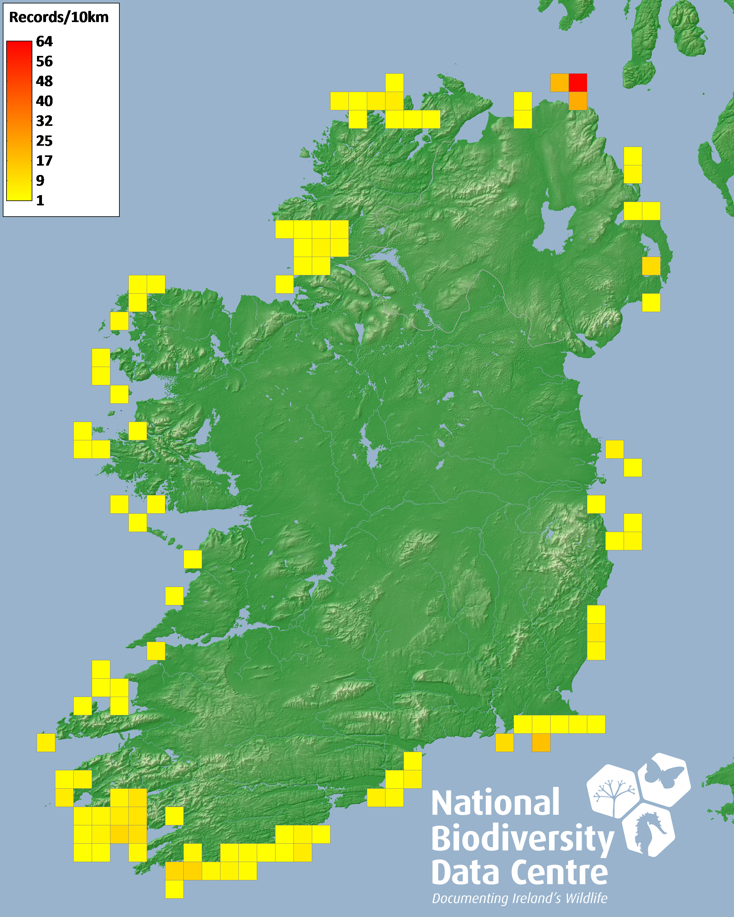 Distribution of the number of records recorded within each 10km grid square (ITM).Marine Map - 50km
