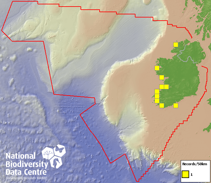 Distribution of the number of records recorded within each 10km grid square (ITM).Marine Map - 50km