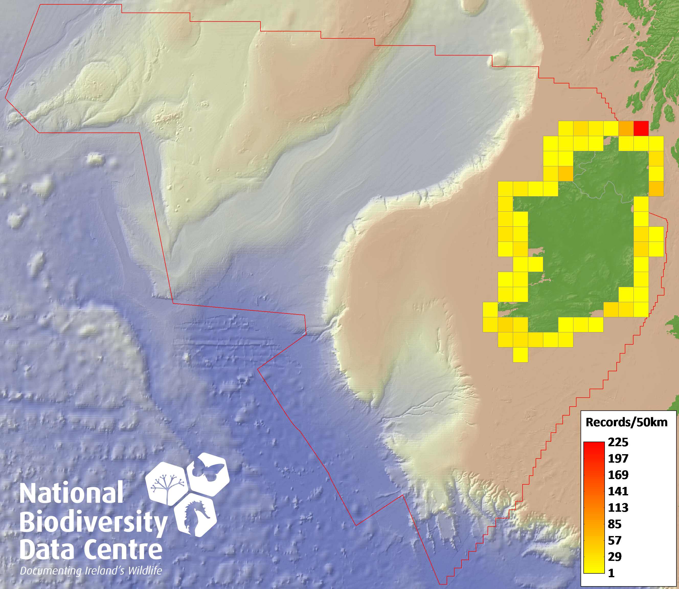 Distribution of the number of records recorded within each 10km grid square (ITM).Marine Map - 50km