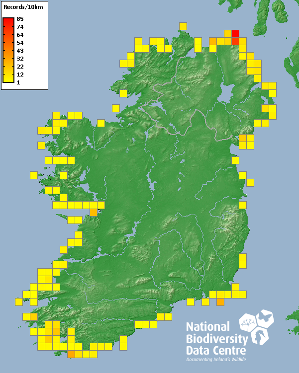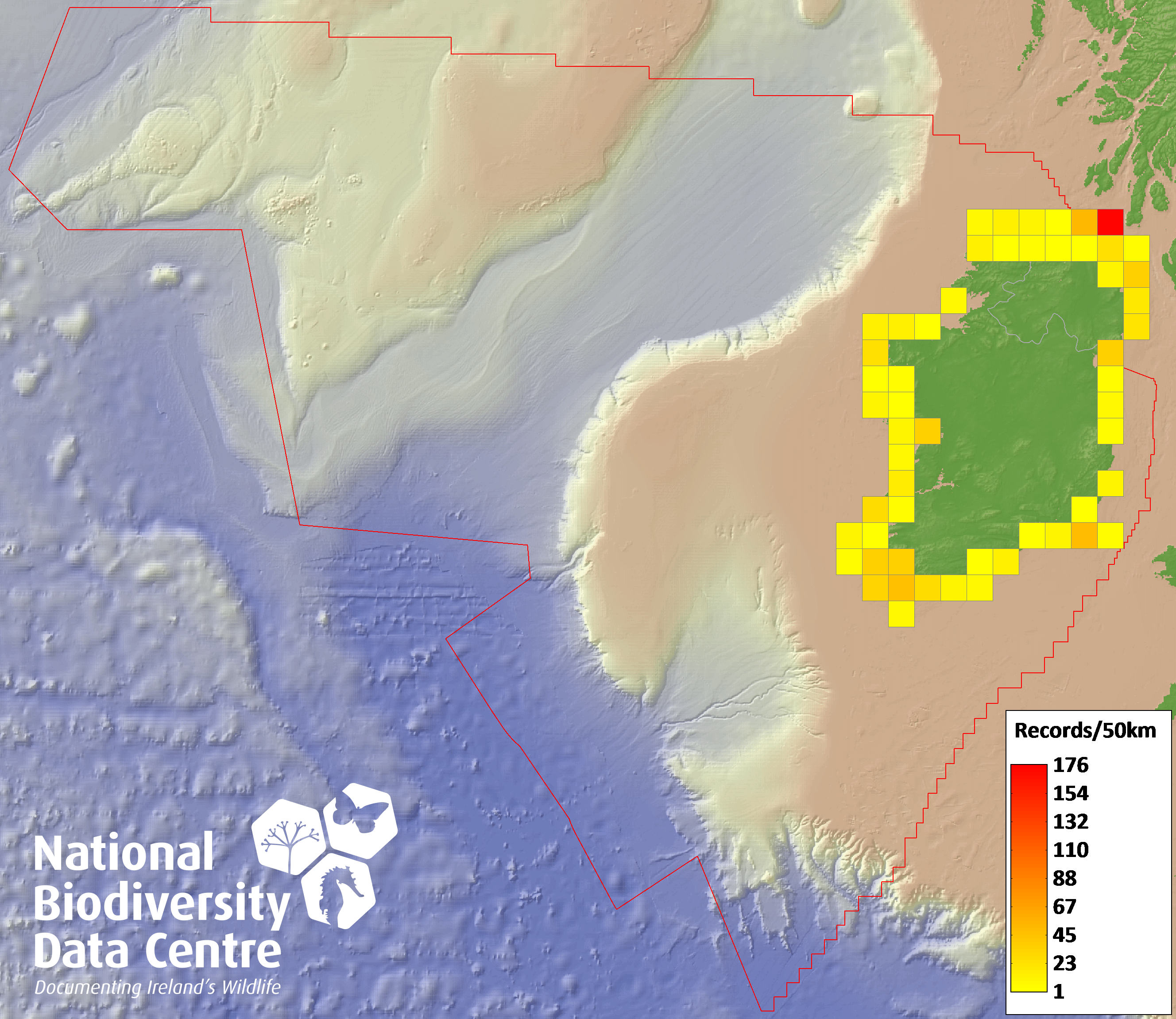 Distribution of the number of records recorded within each 10km grid square (ITM).Marine Map - 50km
