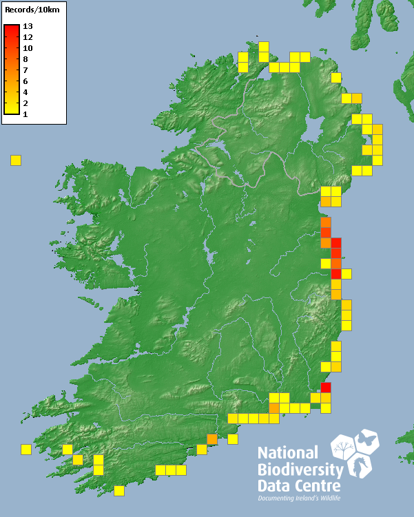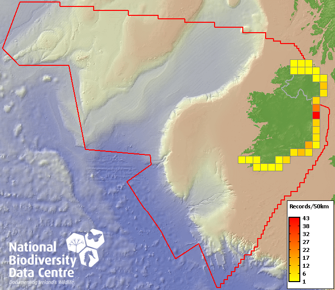 Distribution of the number of records recorded within each 10km grid square (ITM).Marine Map - 50km
