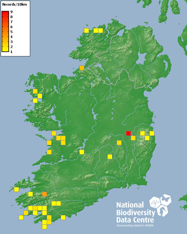 Distribution of the number of records recorded within each 10km grid square (ITM).Marine Map - 50km