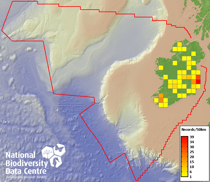 Distribution of the number of records recorded within each 10km grid square (ITM).Marine Map - 50km