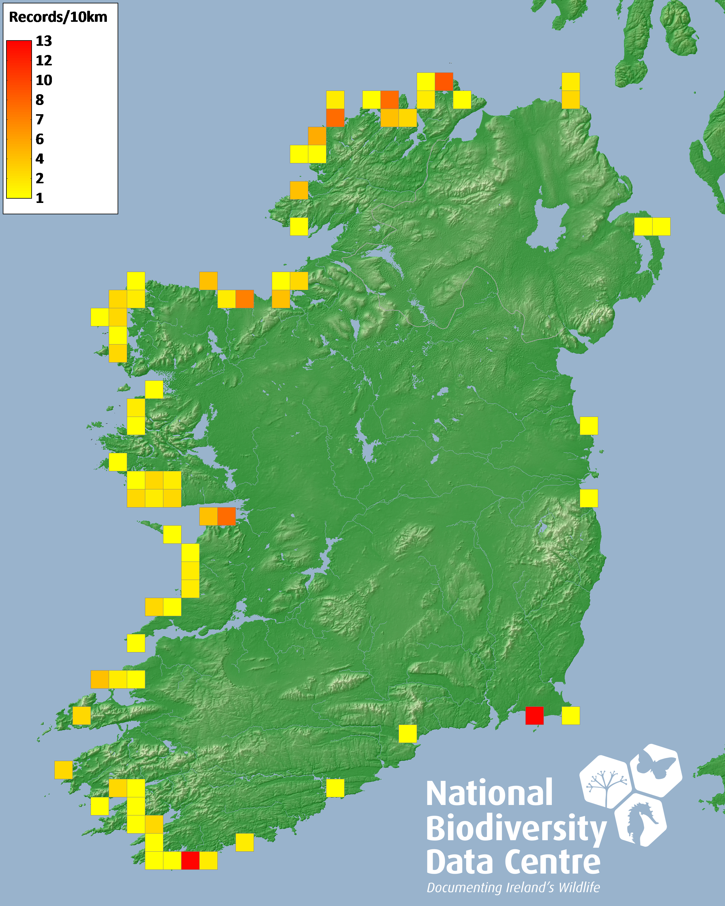 Distribution of the number of records recorded within each 10km grid square (ITM).Marine Map - 50km