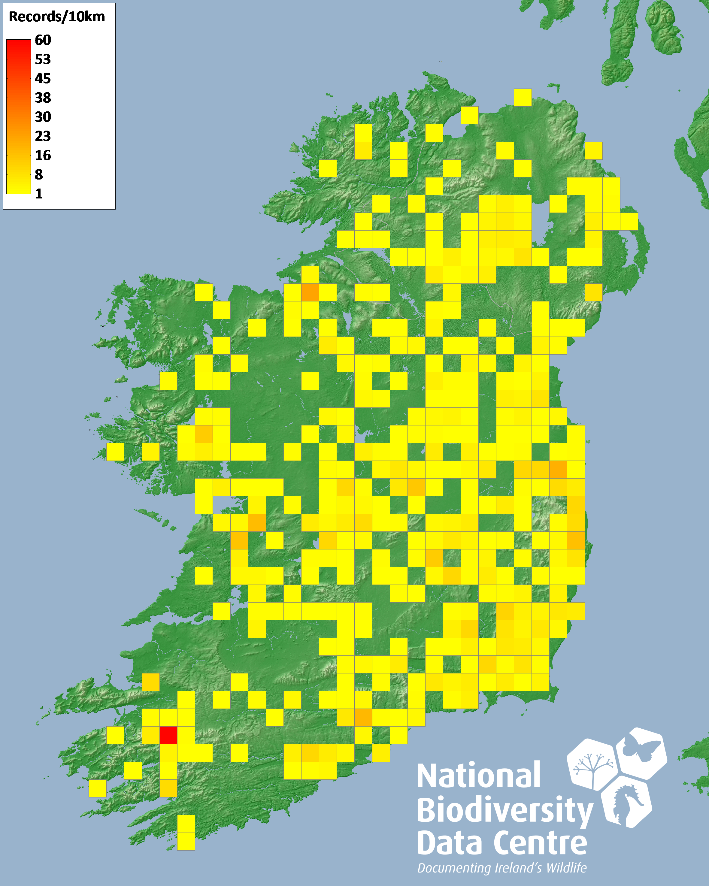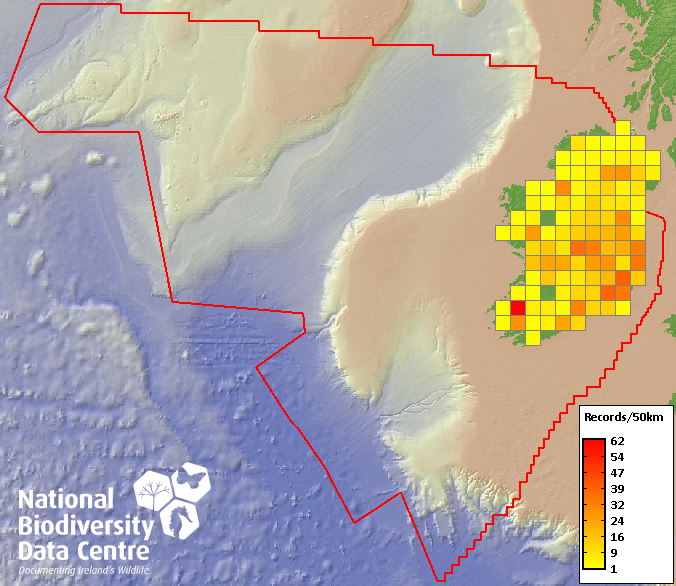 Distribution of the number of records recorded within each 10km grid square (ITM).Marine Map - 50km