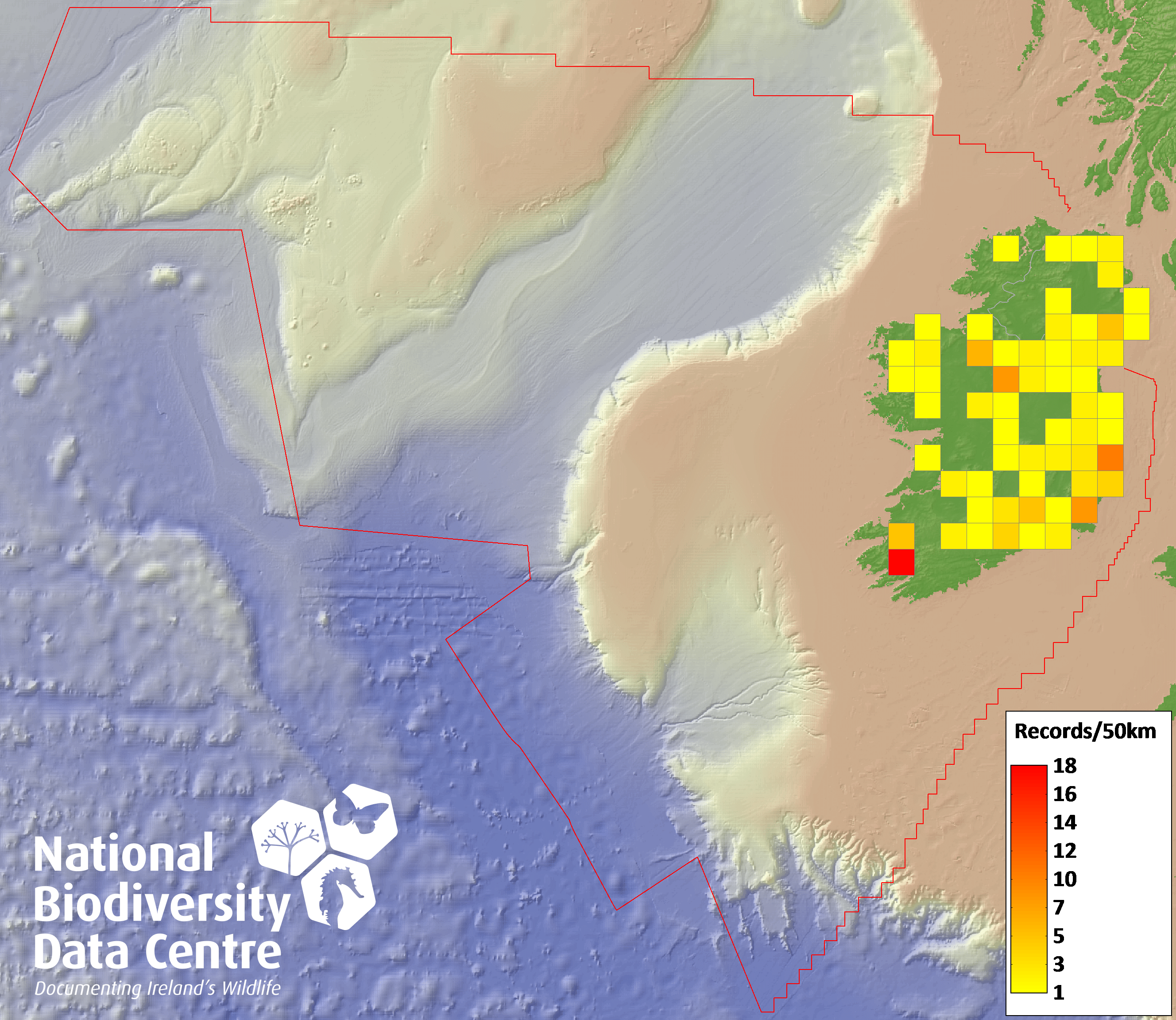 Distribution of the number of records recorded within each 10km grid square (ITM).Marine Map - 50km