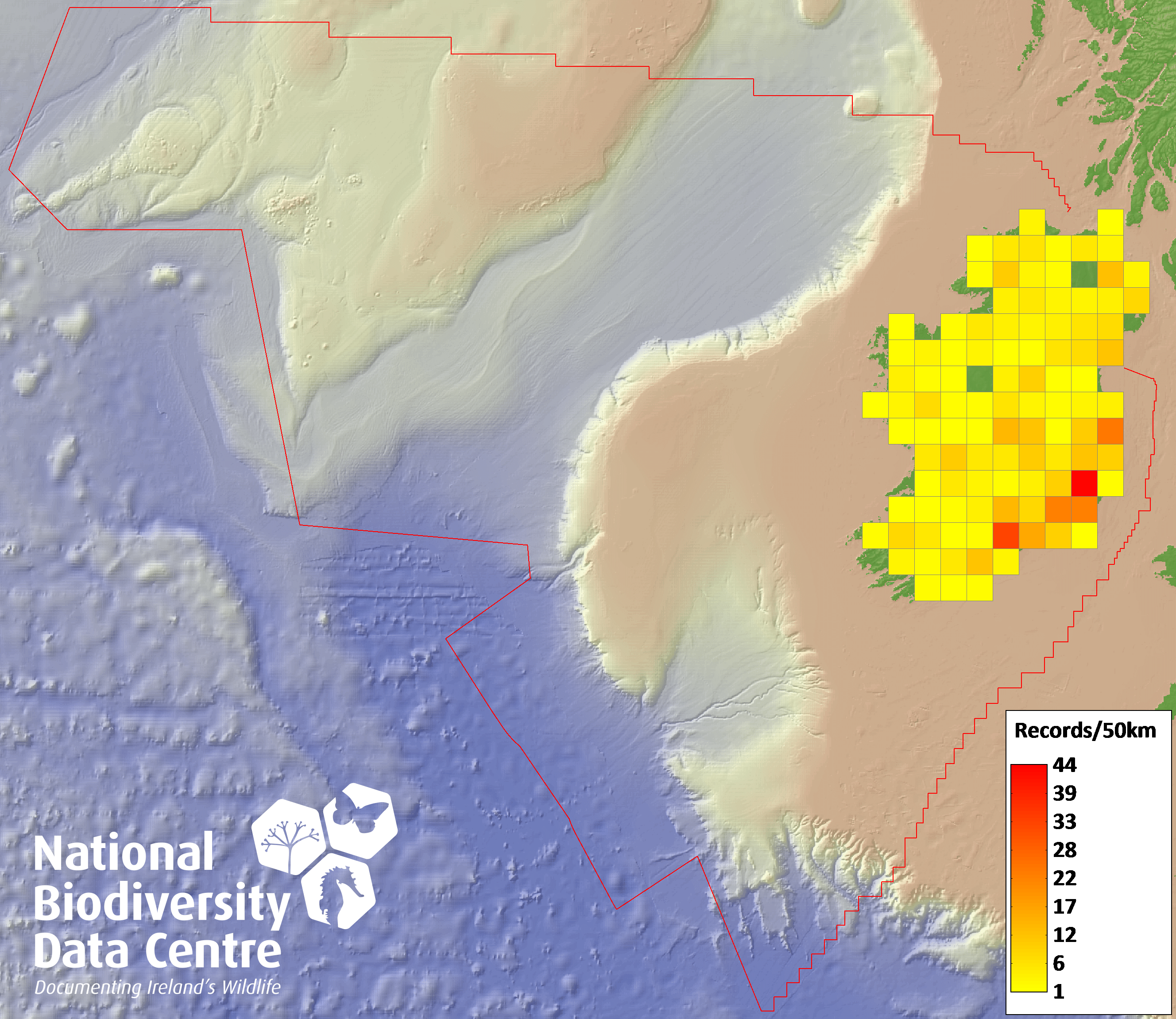 Distribution of the number of records recorded within each 10km grid square (ITM).Marine Map - 50km