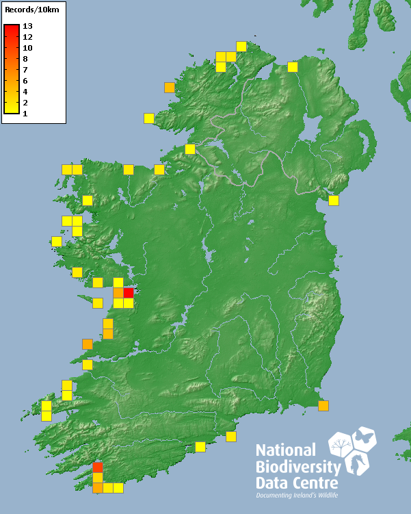 Distribution of the number of records recorded within each 10km grid square (ITM).Marine Map - 50km