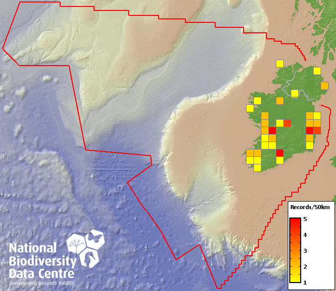 Distribution of the number of records recorded within each 10km grid square (ITM).Marine Map - 50km