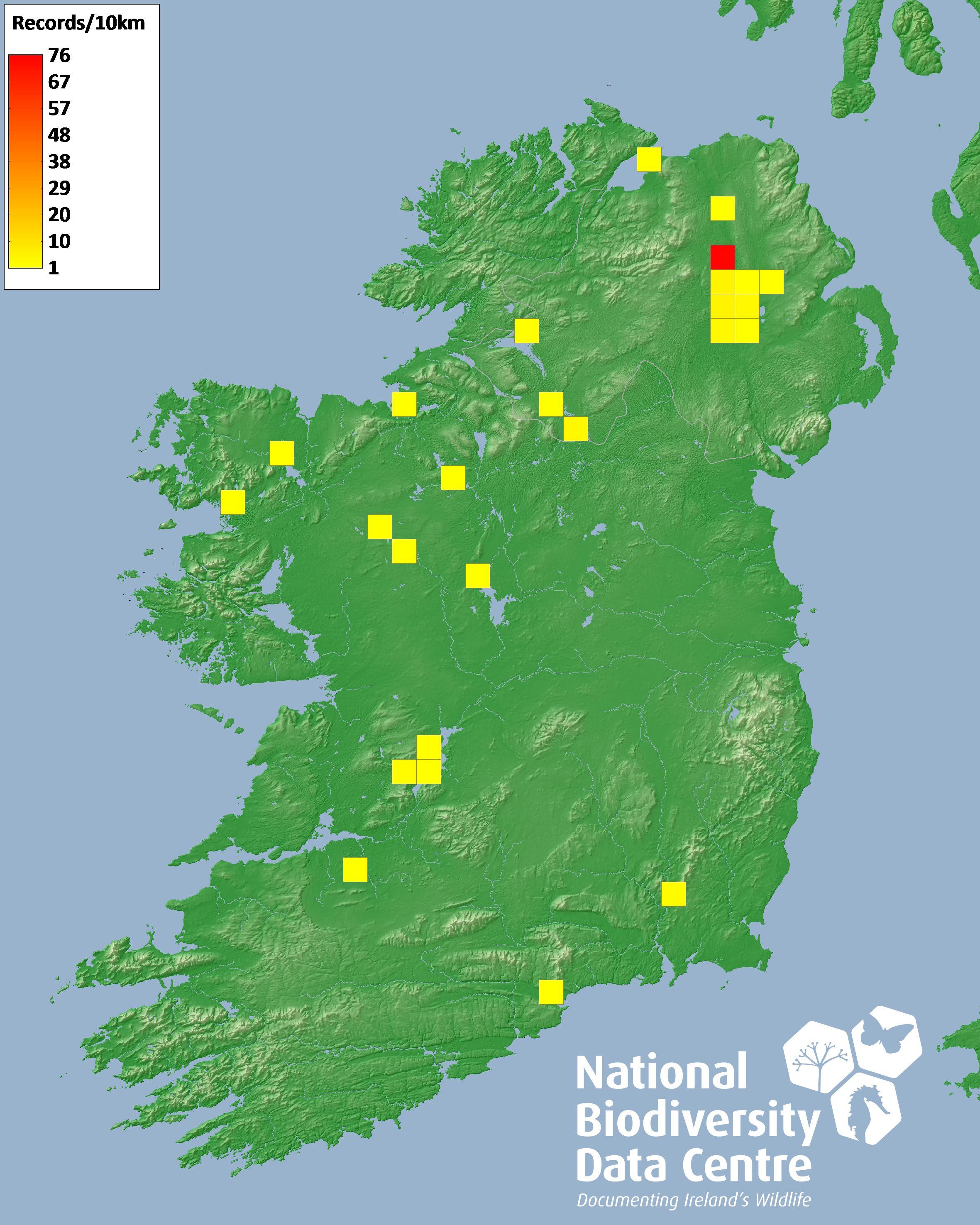 Distribution of the number of records recorded within each 10km grid square (ITM).Marine Map - 50km
