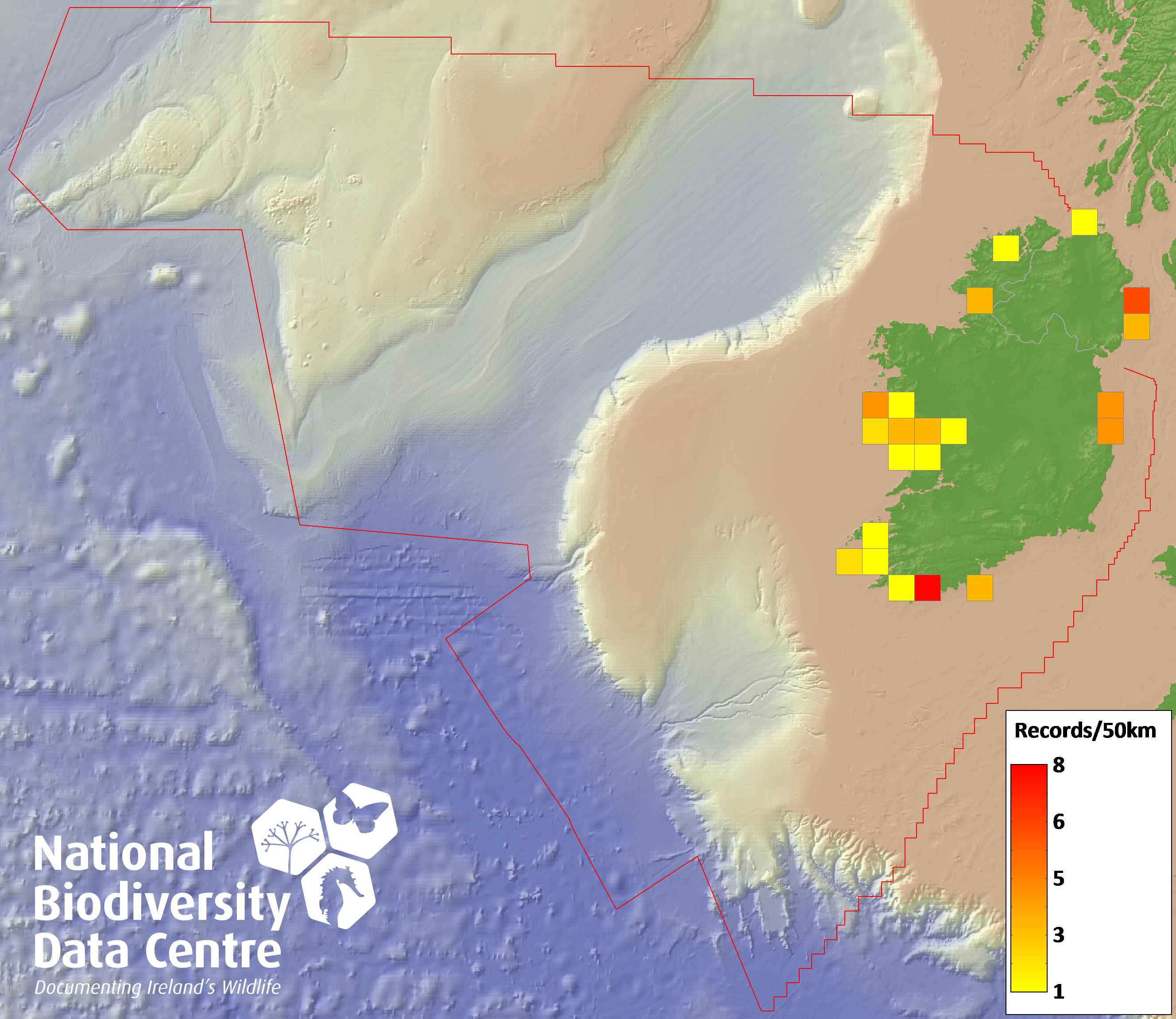 Distribution of the number of records recorded within each 10km grid square (ITM).Marine Map - 50km